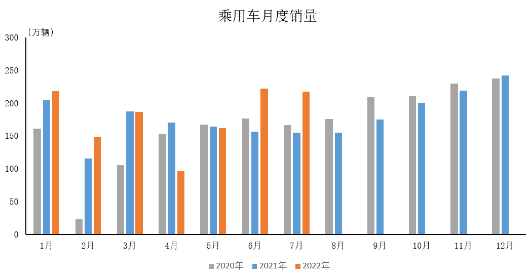 2022年7月,乘用车产销221万辆和217.4万辆,环比下降1.3%和2.1%,同比增长42.6%和40.0%。