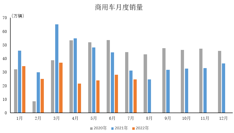 2022年7月,商用车产销24.4万辆和24.6万辆,环比下降6.2%和12.5%,同比下降22.9%和21.5%,降幅比上月有所收窄。