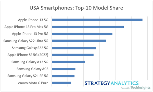 Strategy Analytics:2022年Q2美国最畅销智能手机机型排行榜 2022年Q2美国最畅销智能手机机型:三星Galaxy S22 Ultra 5G是最畅销的安卓机;三星在最畅销的10款智能手机中占5款。苹果在全球和美国市场都有非常强劲的表现。联想-摩托罗拉G Pure是唯一一款进入美国前10的非苹果、非三星机型,该厂商还有4款机型进入前20名。 更多阅读:Strategy Analytics:2021年Q1全球智能手机批发总收入超过1000亿美元Strategy Analytics:2021年Q2全球智能手机出货量同比增长11%,达到3.142亿部Strategy Analytics:2019年Q2全球平板电脑出货量市场份额Strategy Analytics:2022年Q4印度智能手机市场规模同比下降31%Strategy Analytics:2022年Q4全球智能手机出货量至2.96亿部 同比下降19%Strategy Analytics:2023年全球智能手机销量将同比下降5%Strategy Analytics:2022年全球智能手机出货量将同比下降10%Strategy Analytics:2022年Q2全球智能手机应用处理器市场收益达到89亿美元 同比增长26%Strategy Analytics:2022年Q3中国智能手机出货量6690万部 同比下降16%Strategy Analytics:2022年Q1全球智能手机内存收入115亿美元Strategy Analytics:2022年全球智能手机安装量将增长3%Strategy Analytics:2022年6.18期间中国售出1400万部智能手机Strategy Analytics:2021年智能手机射频收发器市场份额Strategy Analytics:2022年Q1中国智能手机出货量7190万 同比下降17%Strategy Analytics:2021年全球智能手机电池市场规模为87亿美元