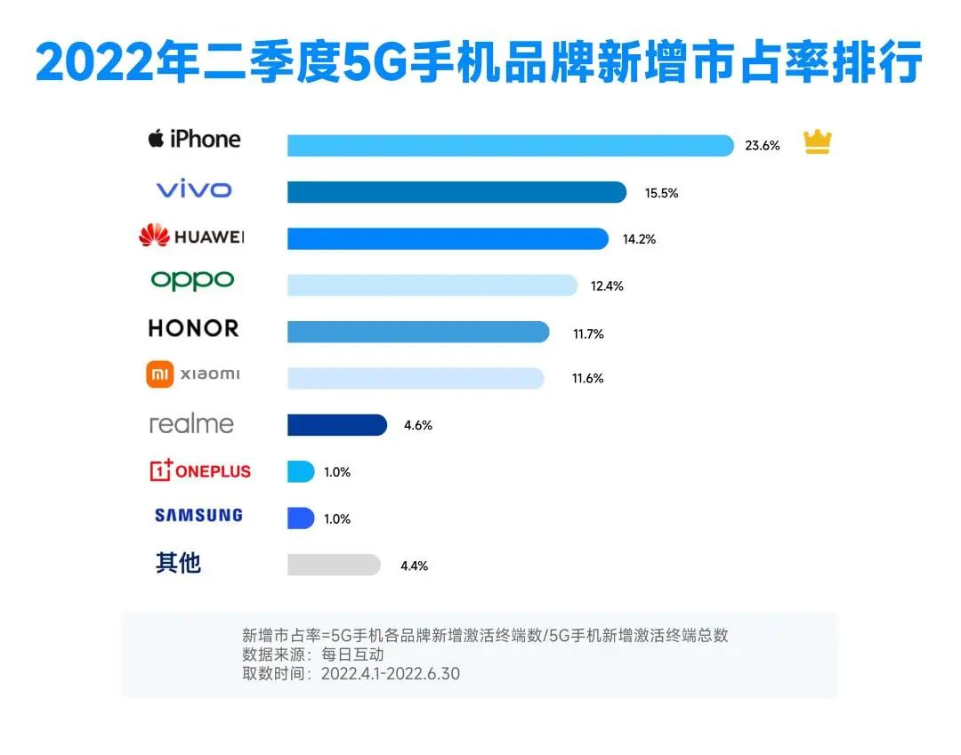每日互动大数据显示,华为5G手机以20.8%的市占率,领跑国内5G手机市场;iPhone 5G手机市占率达19.4%,较一季度17.4%的市占率持续上升;vivo 5G手机市占率排名第三,达16.7%;OPPO 5G手机以13.7%的市占率排名第四;荣耀5G手机市占率排名跻身前五,其市占率达11.1%,较一季度排名上升一位。