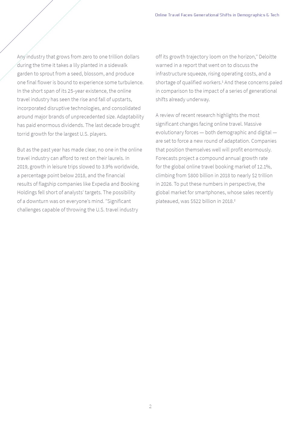 但正如过去一年的数据所表明的那样,在线旅游行业没有人能坐享其成。2019年,全球休闲旅行增长率放缓至3.9%,比2018年低一个百分点。Expedia 和 Booking Holdings 等旗舰公司的财务业绩低于分析师的目标。每个人都想到了经济下滑的可能性。德勤在一份报告中警告说:“能够使美国旅游业脱离其增长轨迹的重大挑战迫在眉睫”。