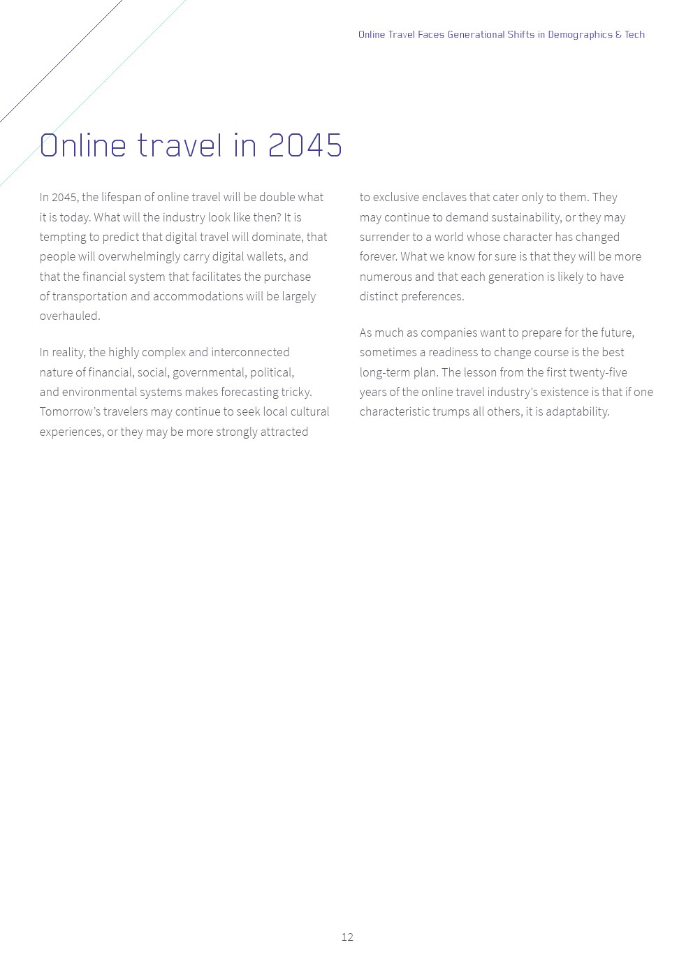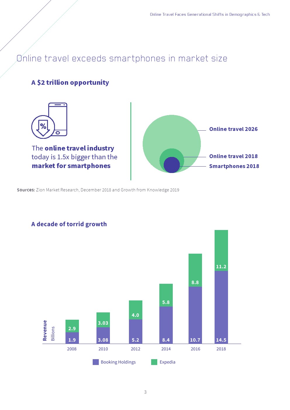 对近期研究的回顾强调了在线旅游面临的最重大的变化。巨大的进化力量,包括人口和数字将推动新一轮的适应。定位良好的公司将获得巨大的利润。预计全球在线旅游预订市场的复合年增长率为12.1%,从2018年的8000亿美元增长至2026年的近2万亿美元。为了获得更清晰的印象,最近销售趋于稳定的全球智能手机市场在2018年为5220亿美元。现在的在线旅游行业是智能手机市场的 1.5 倍。
