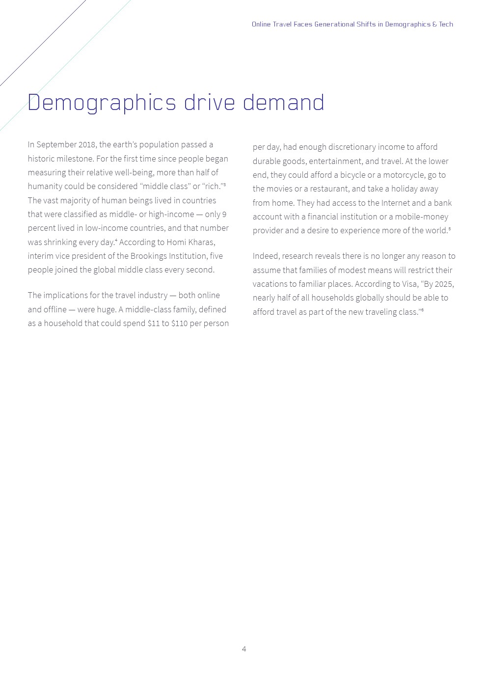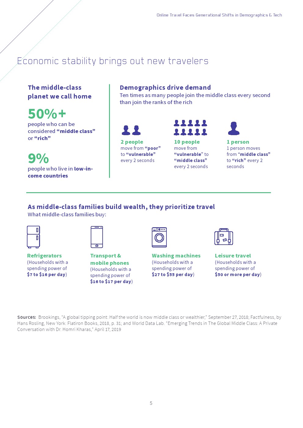人口统计属性对在线和离线旅游业的影响是巨大的。中产阶级家庭,即每人每天花费 11 -110 美元的家庭,有足够的可支配收入来支付耐用品、娱乐和旅行。他们买得起自行车或摩托车,可以去看电影或去餐馆,可以离家度假。 他们可以访问互联网并在金融机构或移动货币提供商处开设银行账户,并渴望体验更广泛的世界。