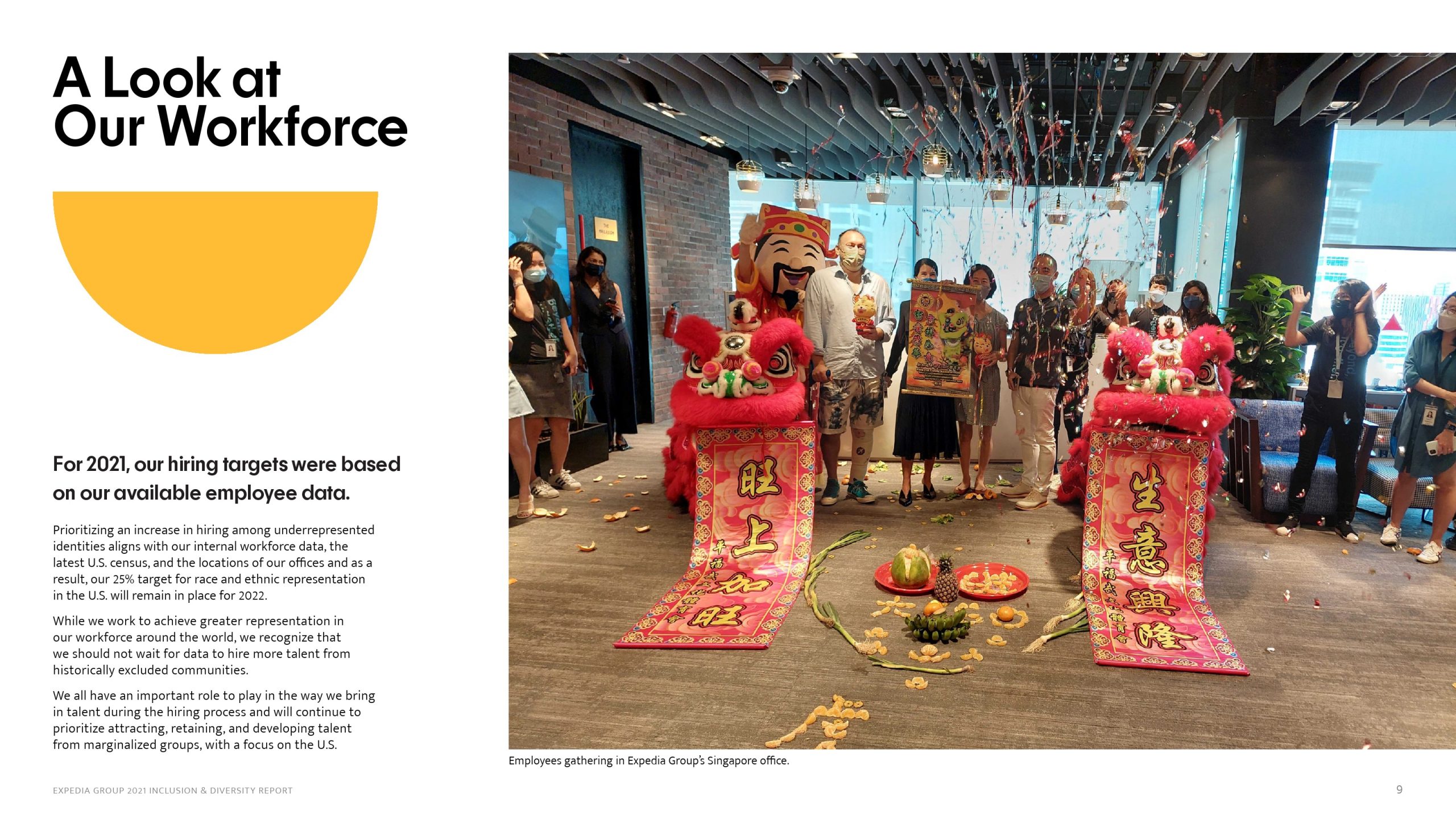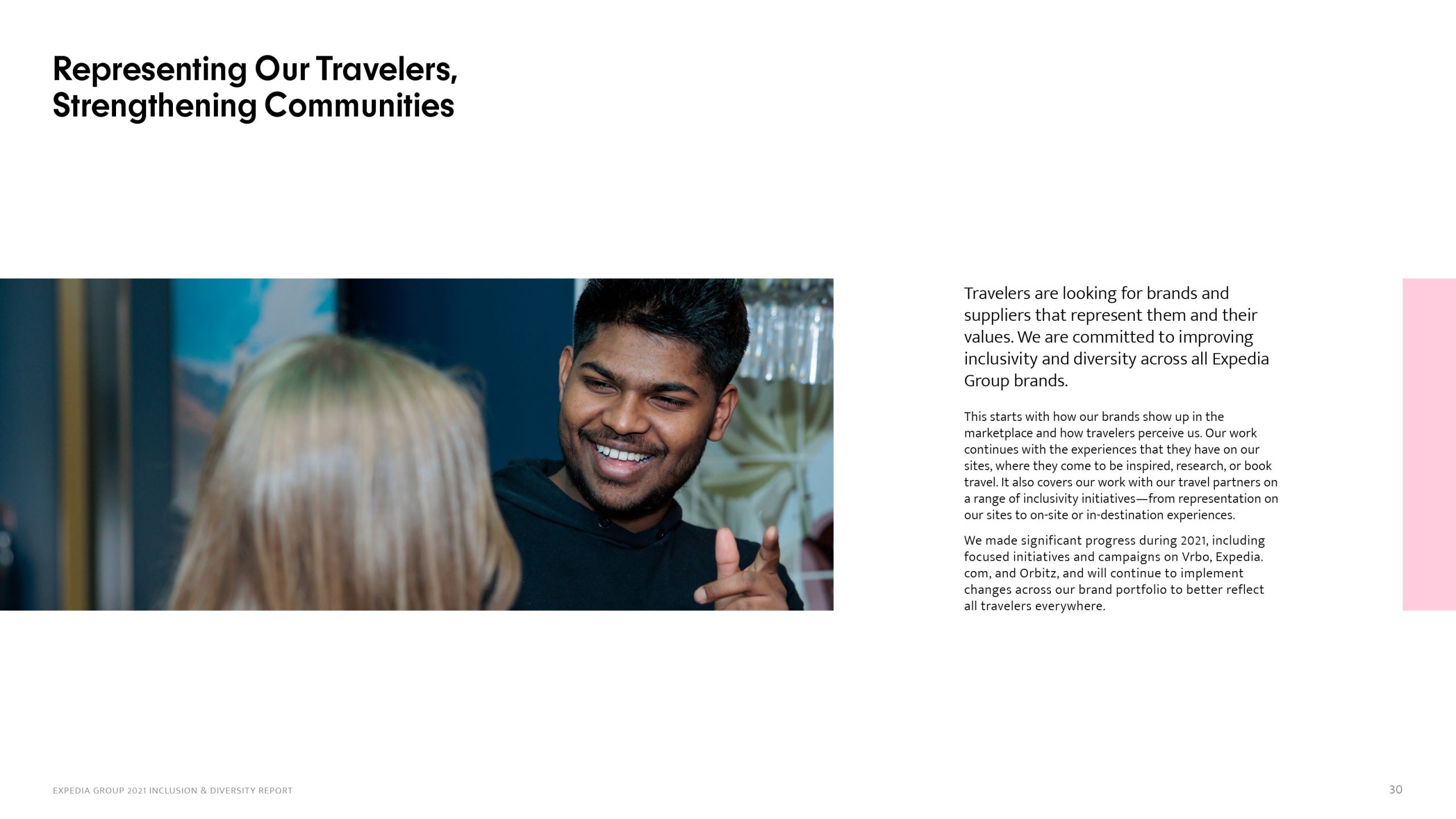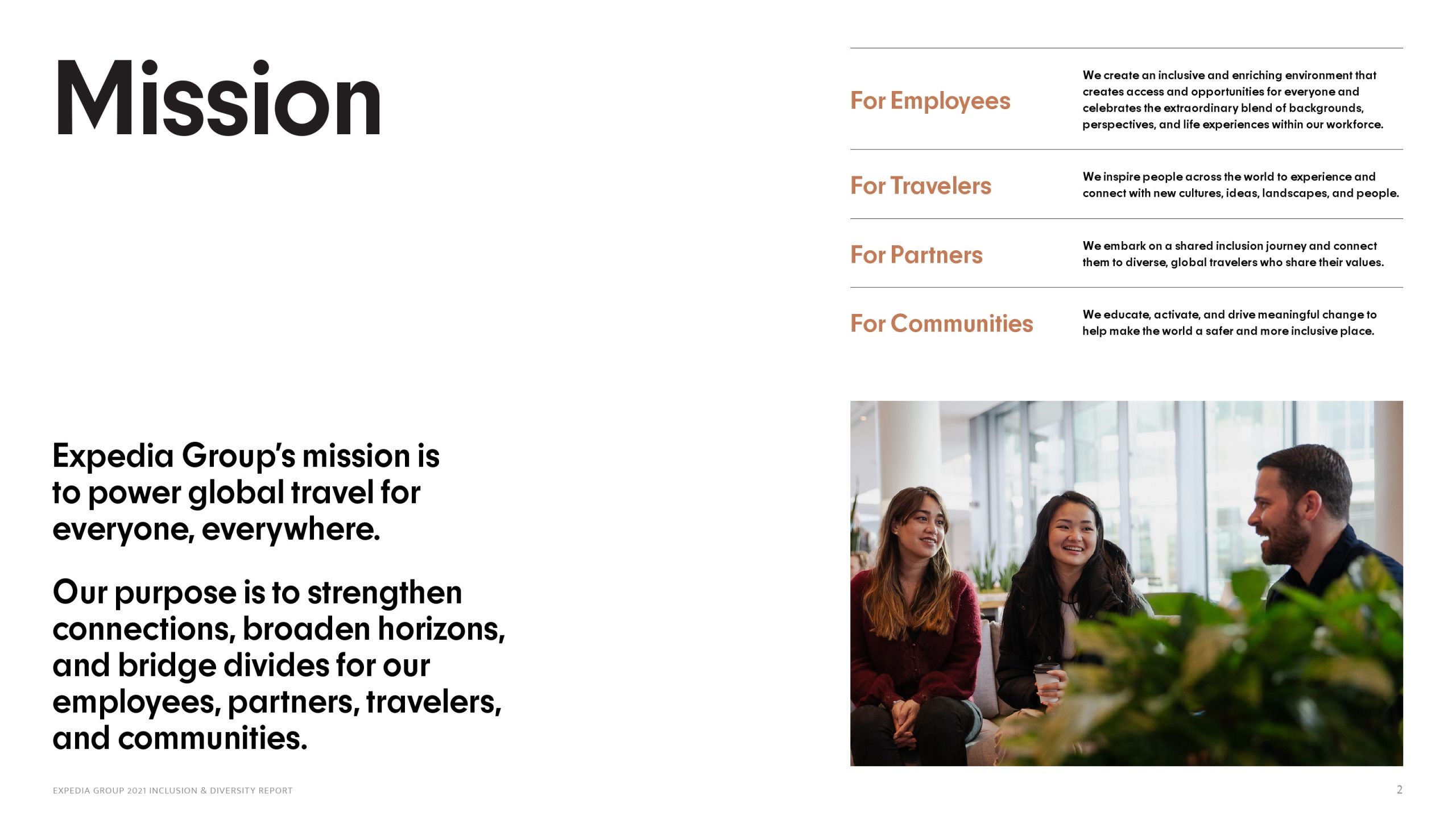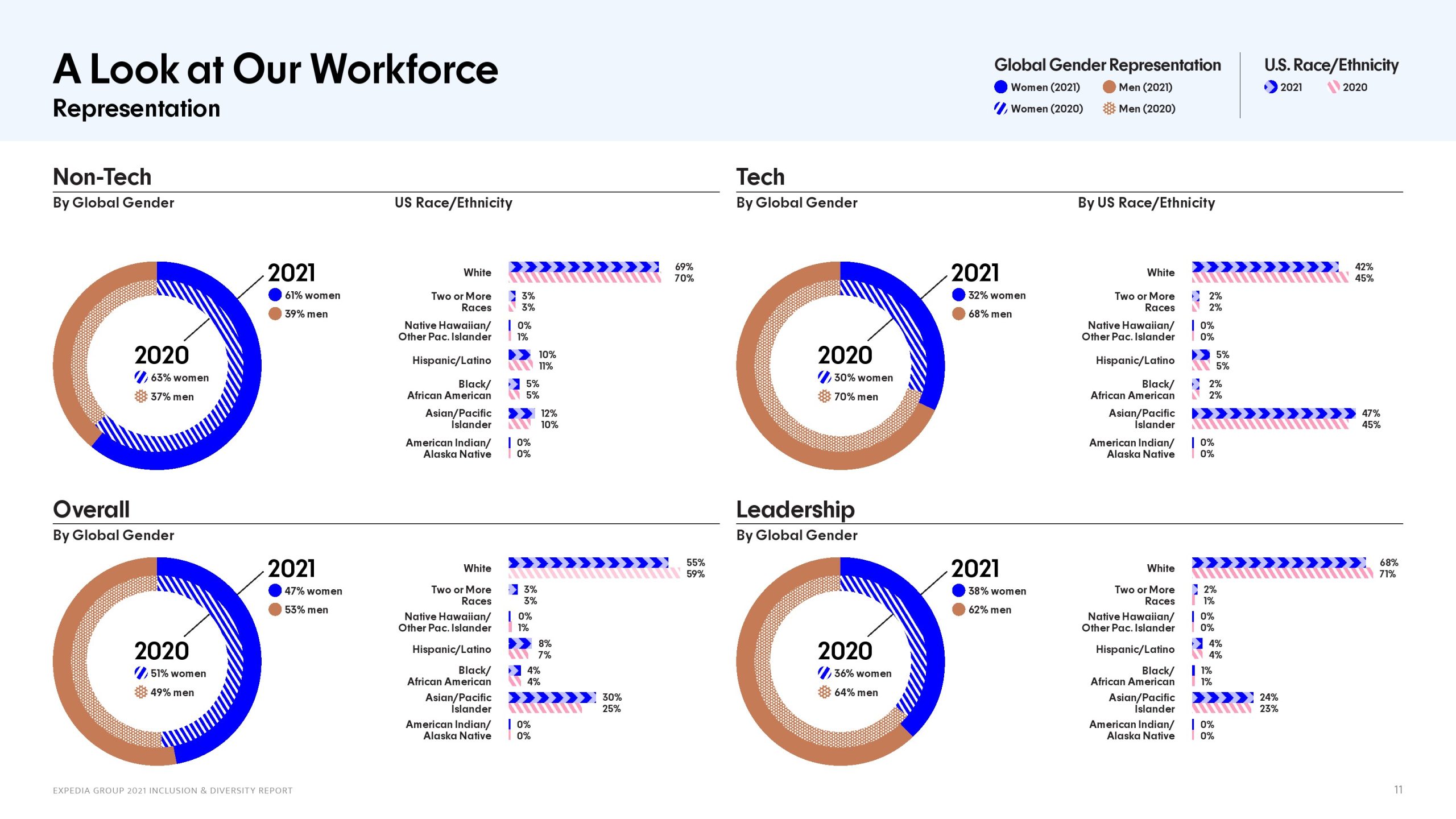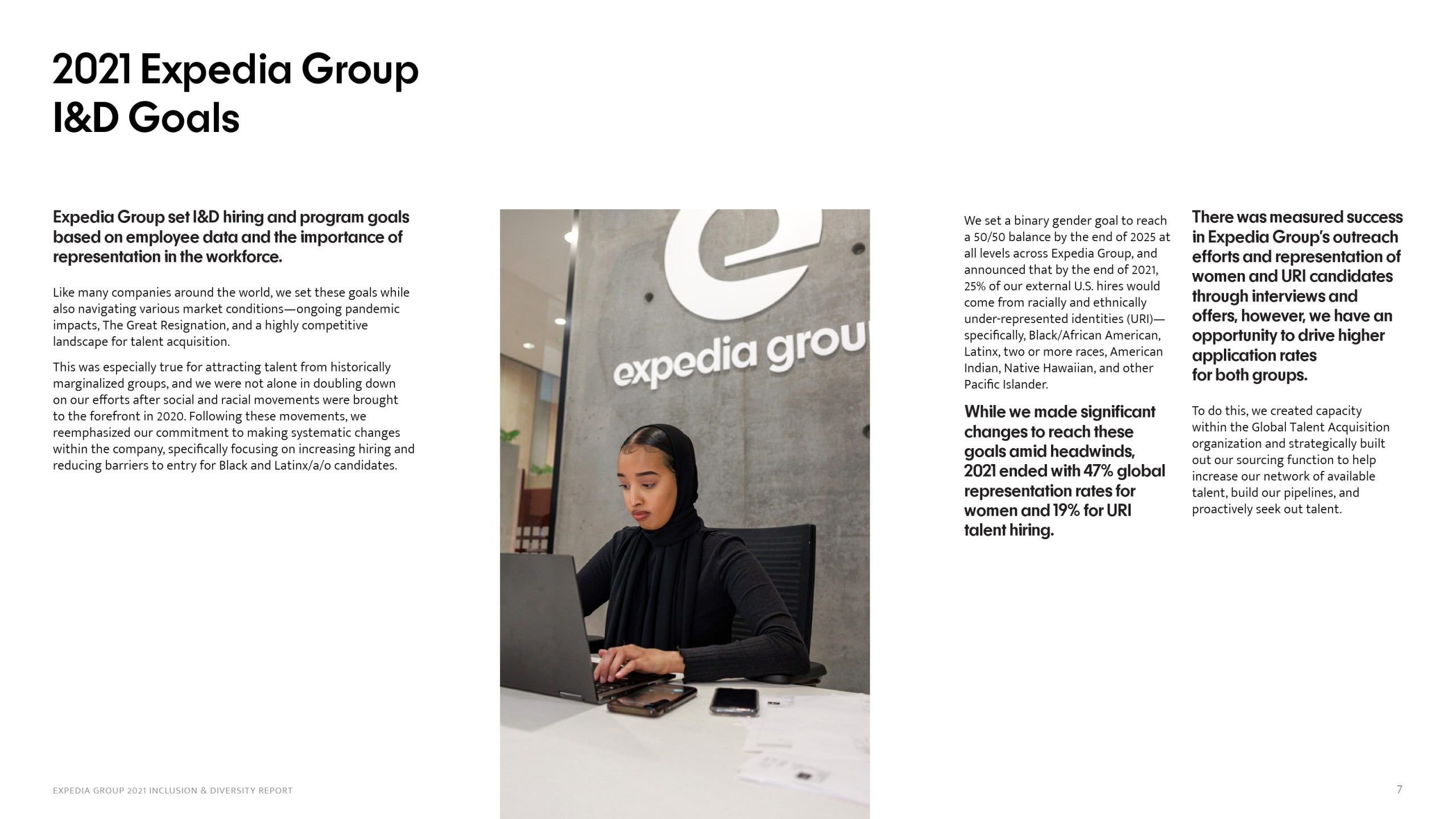 我们设定了一个二元性别目标,即到2025年底在 Expedia Group 的所有级别上达到50/50的平衡,并宣布到2021年底,25%的外部员工将来自种族和民族代表性不足的群体(URI)。具体来说,包括非州裔美国人、拉丁裔、两个或更多种族、美洲印第安人、夏威夷原住民和其他太平洋岛民。