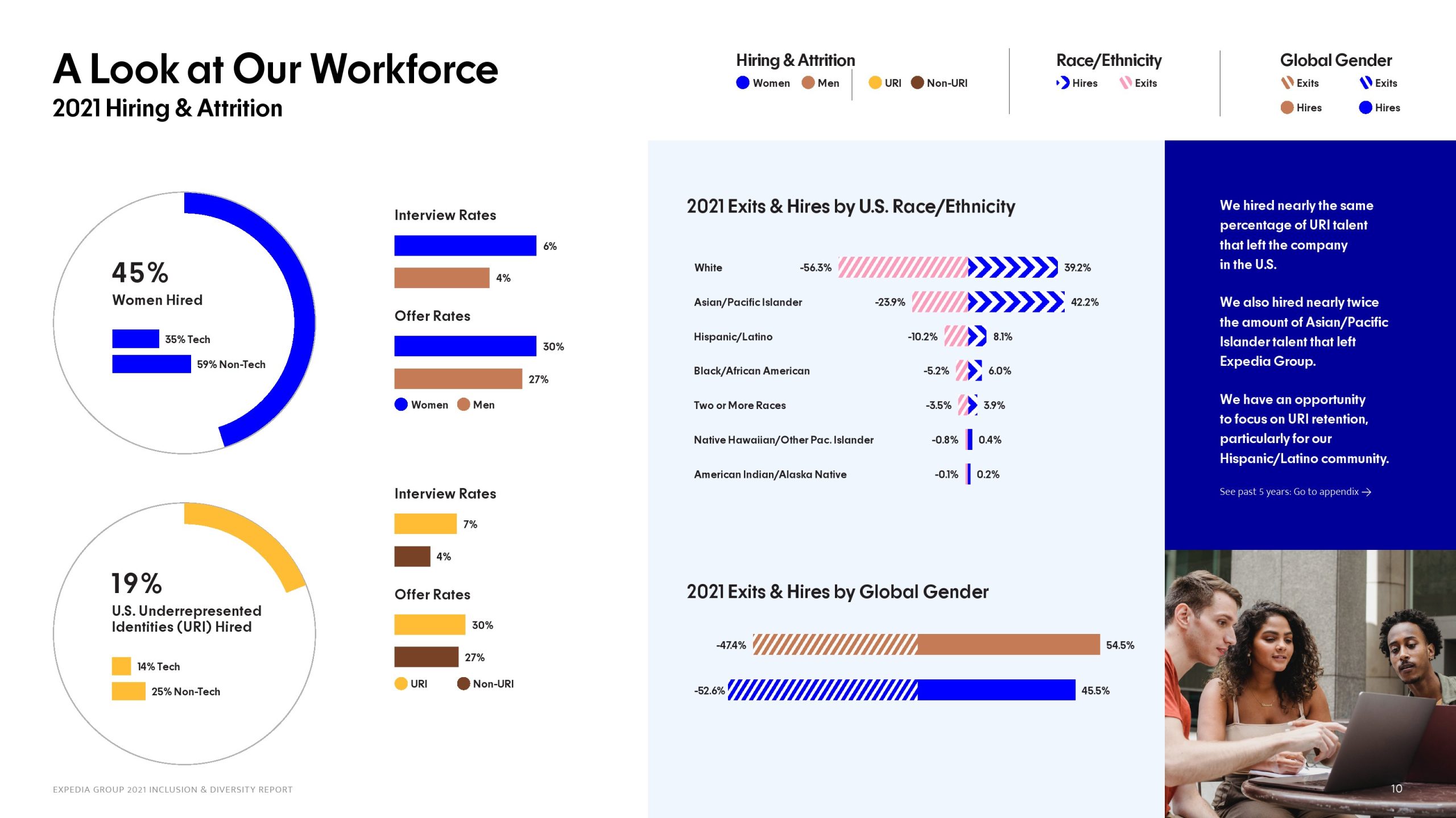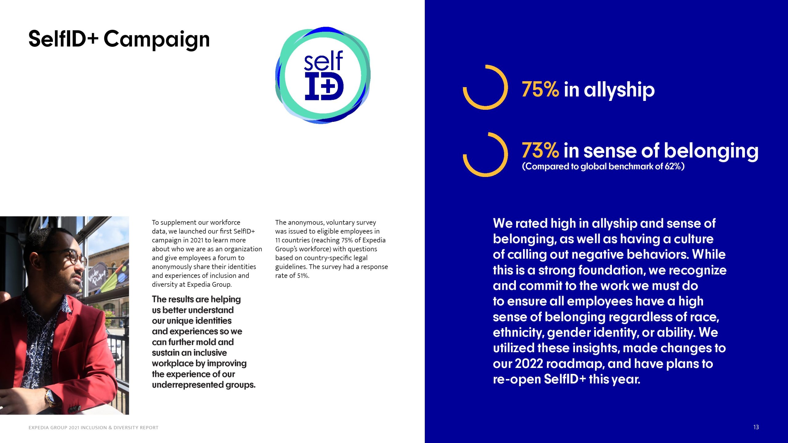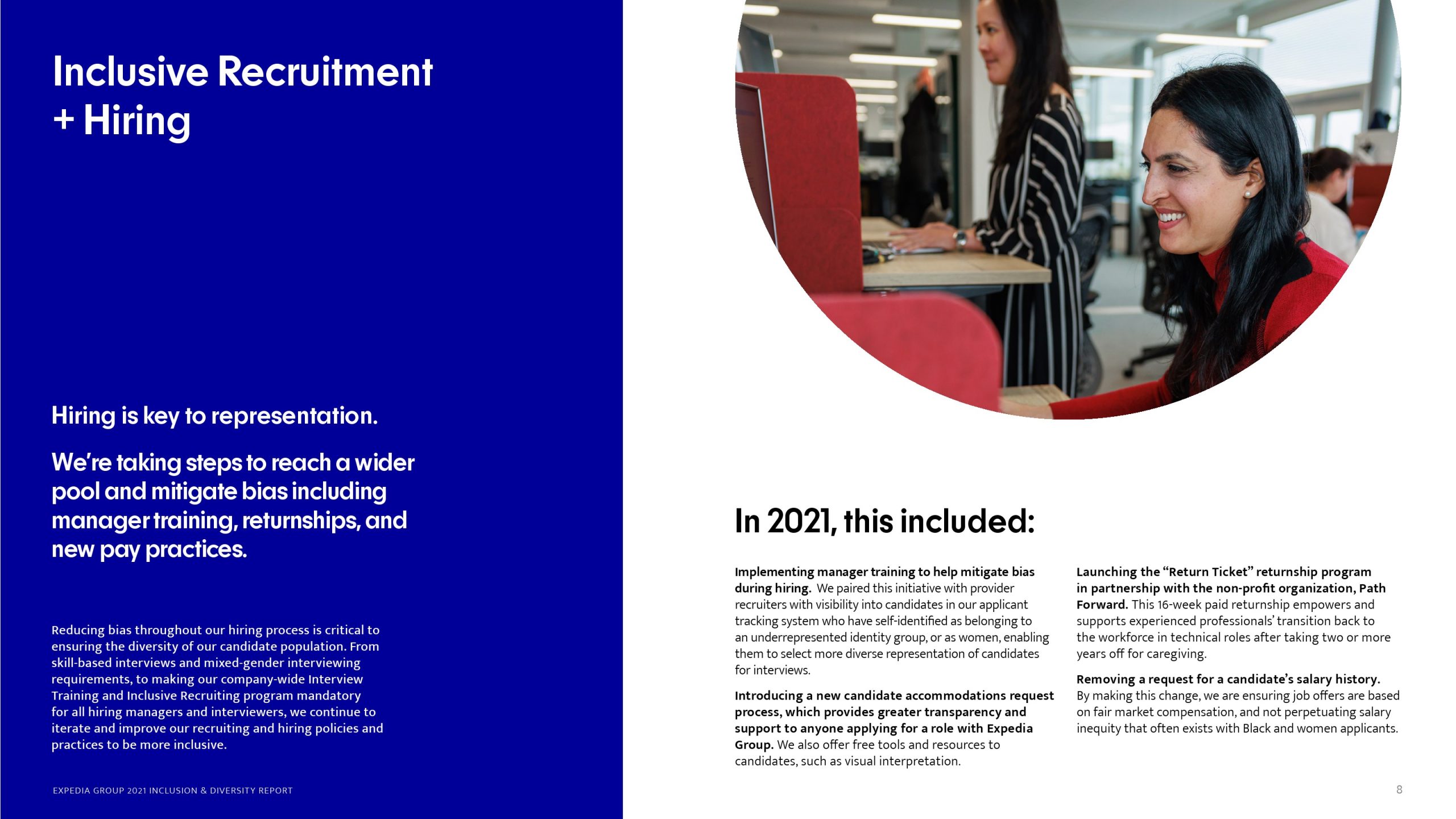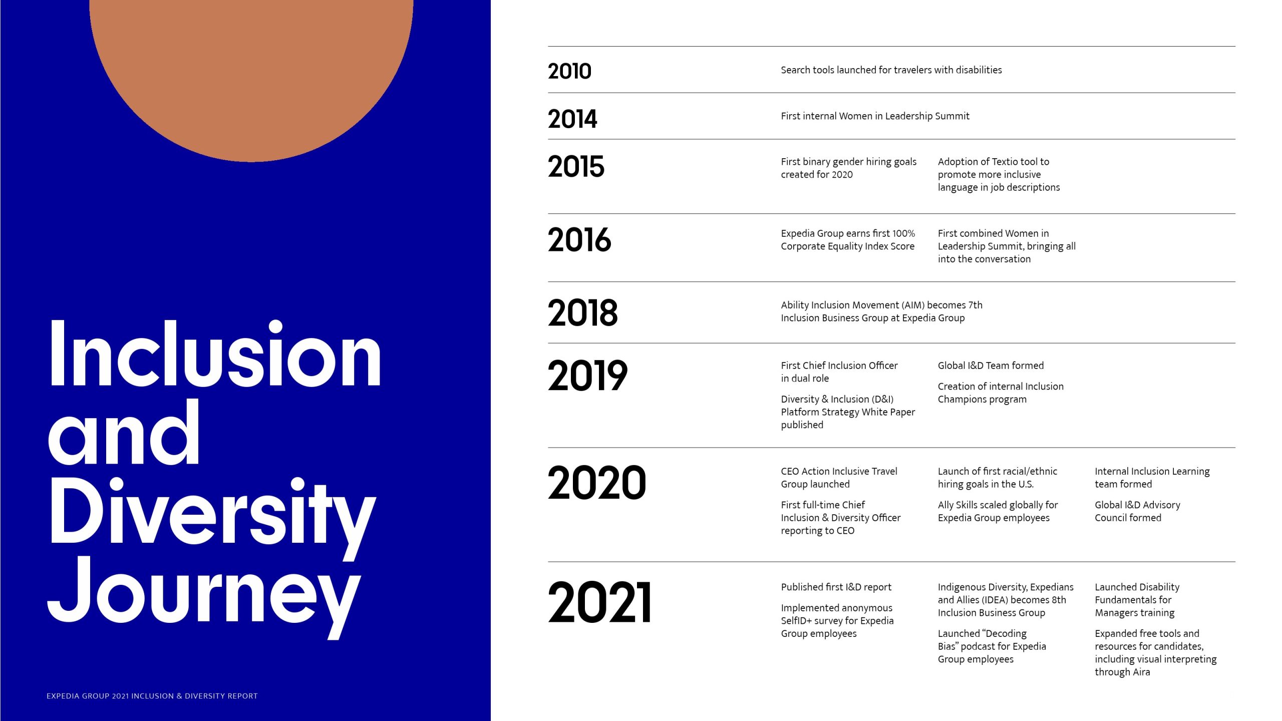 我们设定了一个二元性别目标,即到2025年底在 Expedia Group 的所有级别上达到50/50的平衡,并宣布到2021年底,25%的外部员工将来自种族和民族代表性不足的群体(URI)。具体来说,包括非州裔美国人、拉丁裔、两个或更多种族、美洲印第安人、夏威夷原住民和其他太平洋岛民。