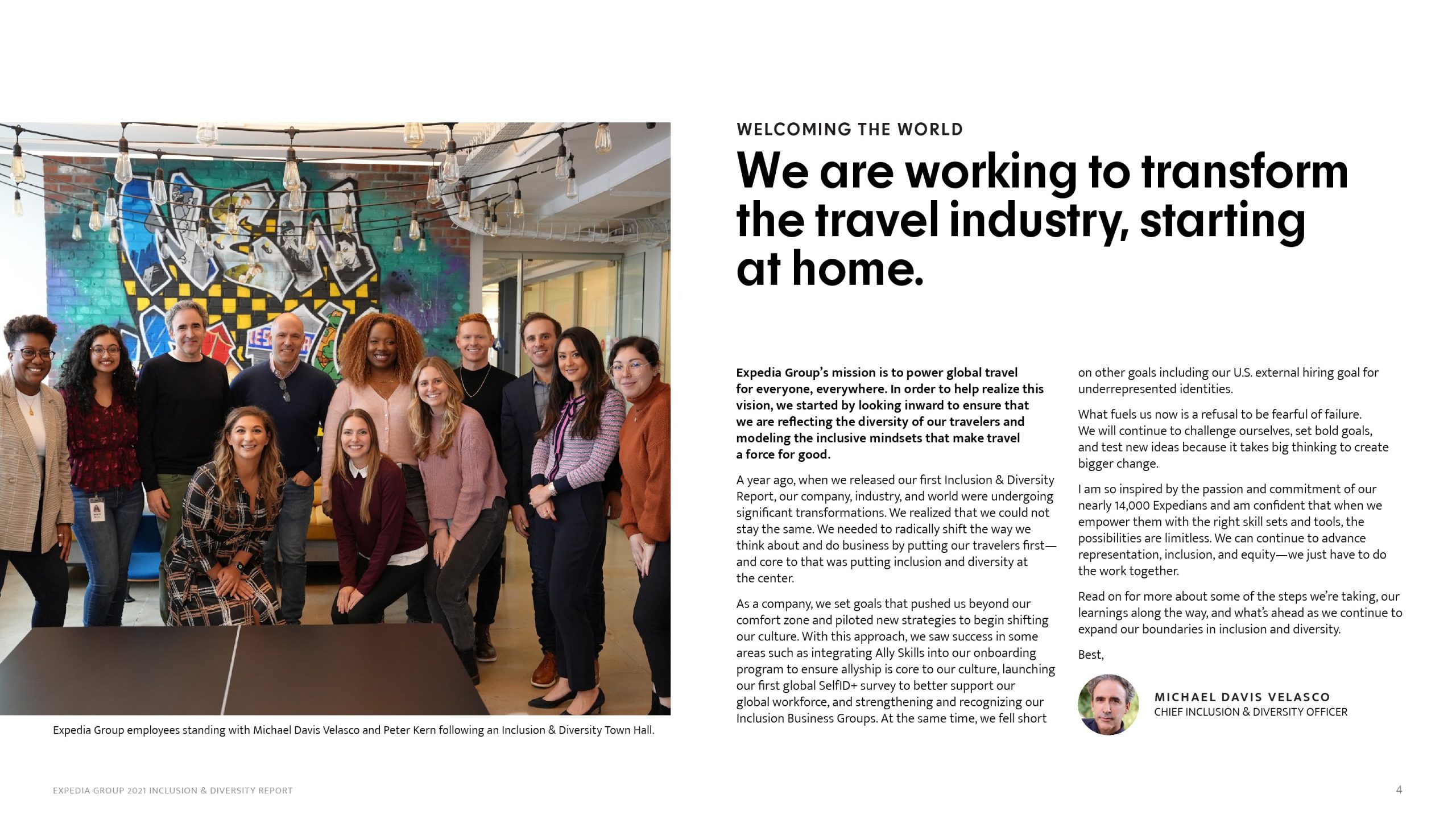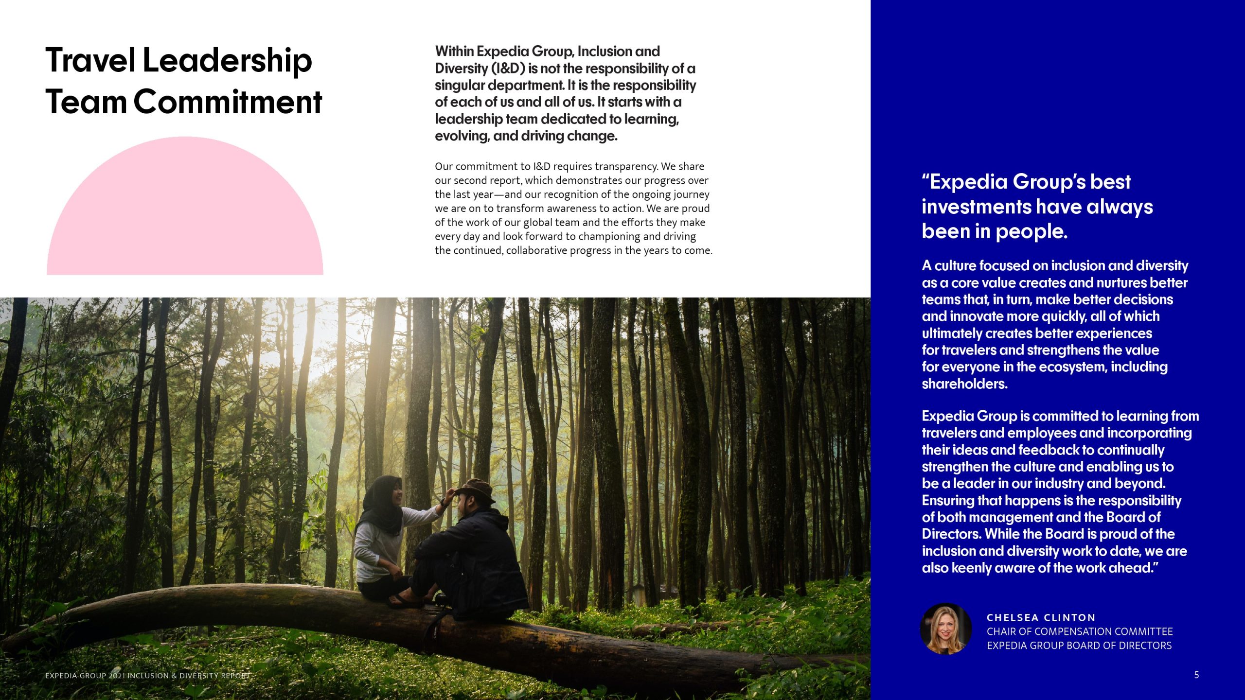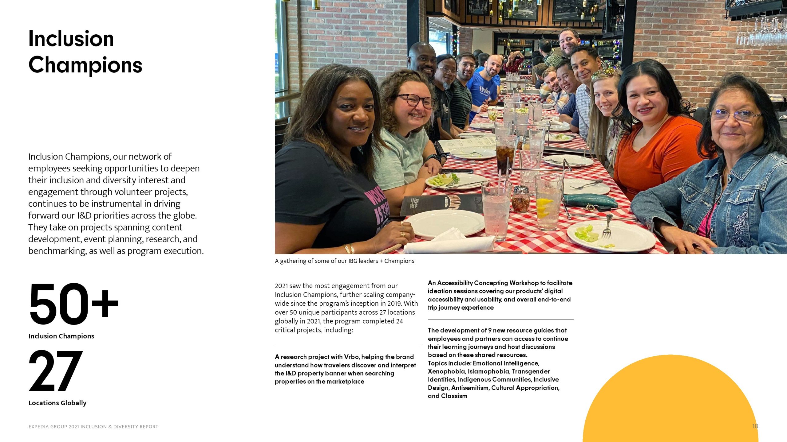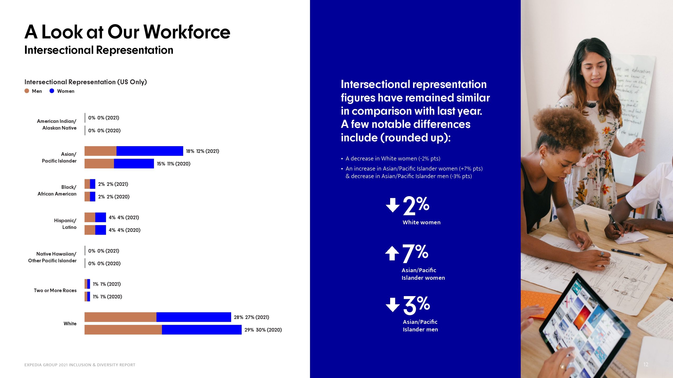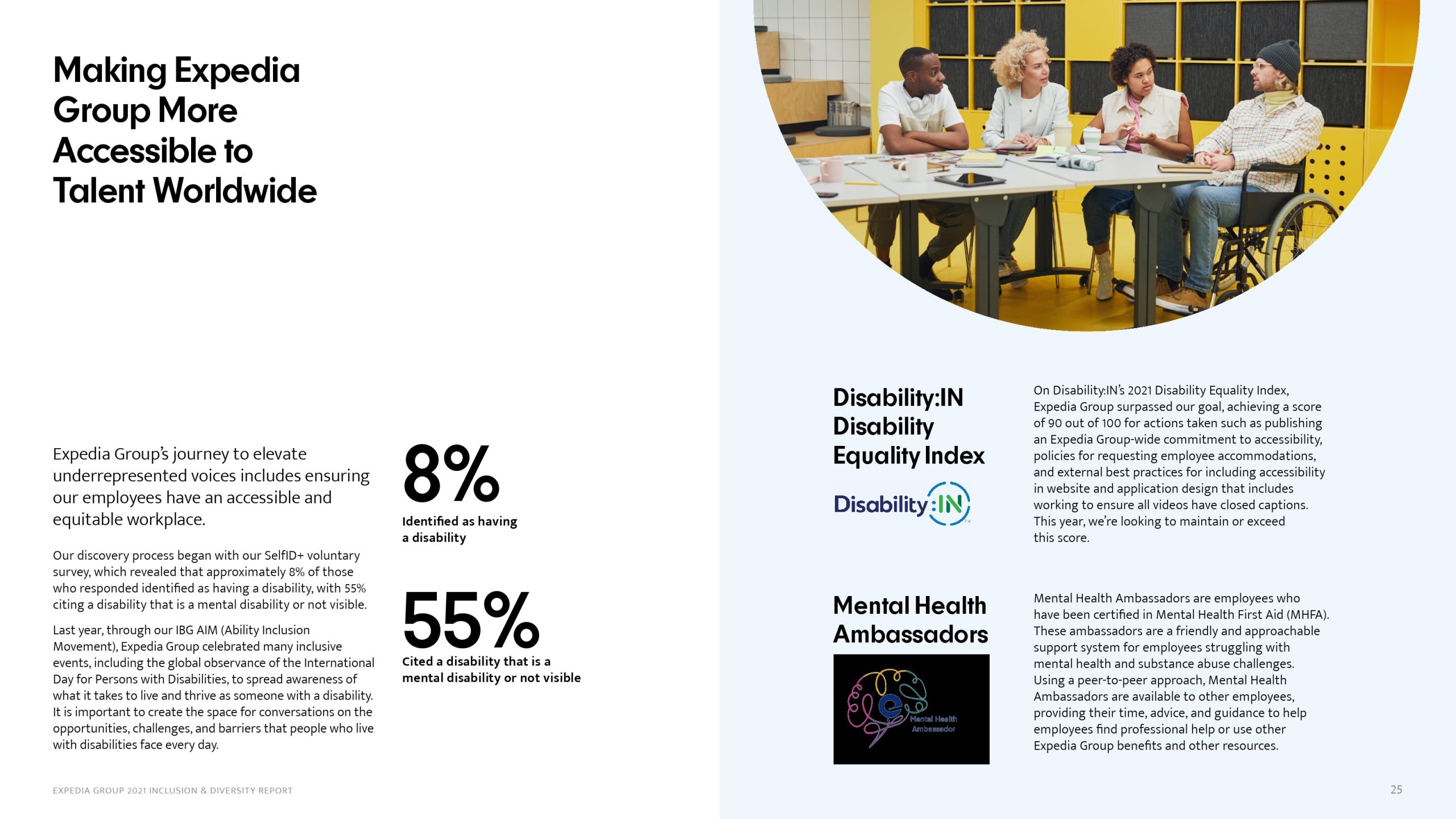 我们设定了一个二元性别目标,即到2025年底在 Expedia Group 的所有级别上达到50/50的平衡,并宣布到2021年底,25%的外部员工将来自种族和民族代表性不足的群体(URI)。具体来说,包括非州裔美国人、拉丁裔、两个或更多种族、美洲印第安人、夏威夷原住民和其他太平洋岛民。