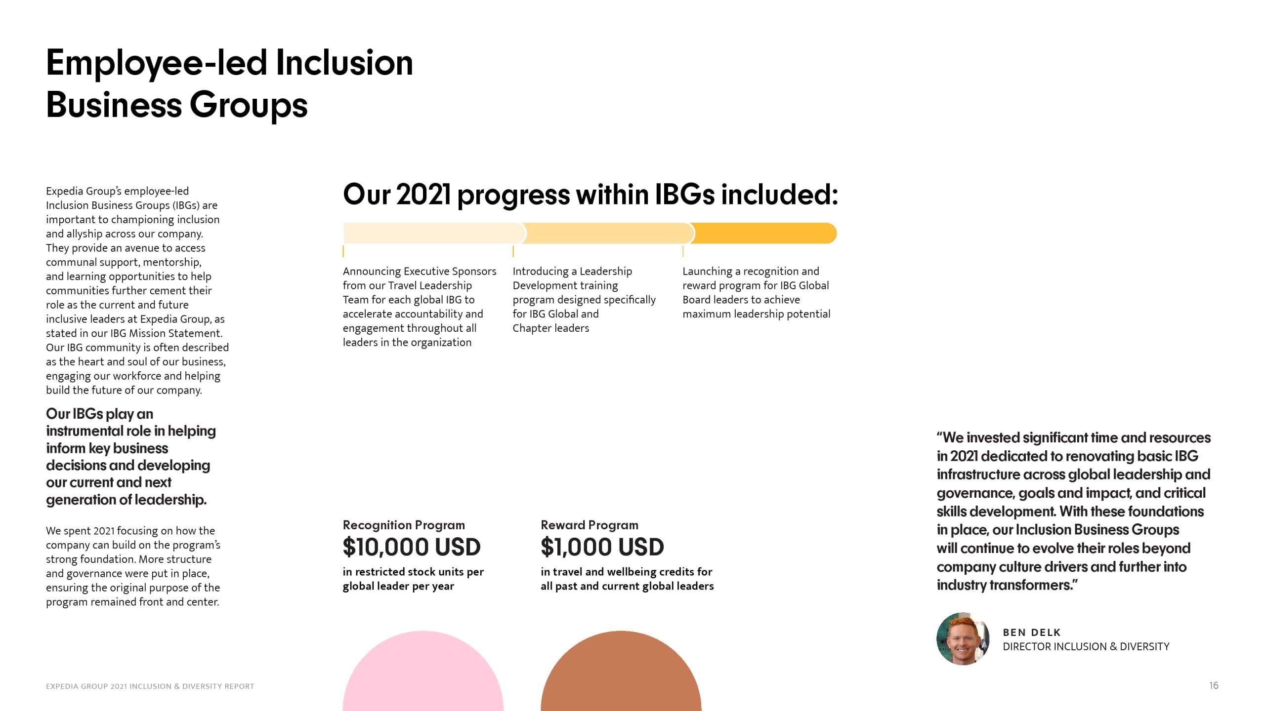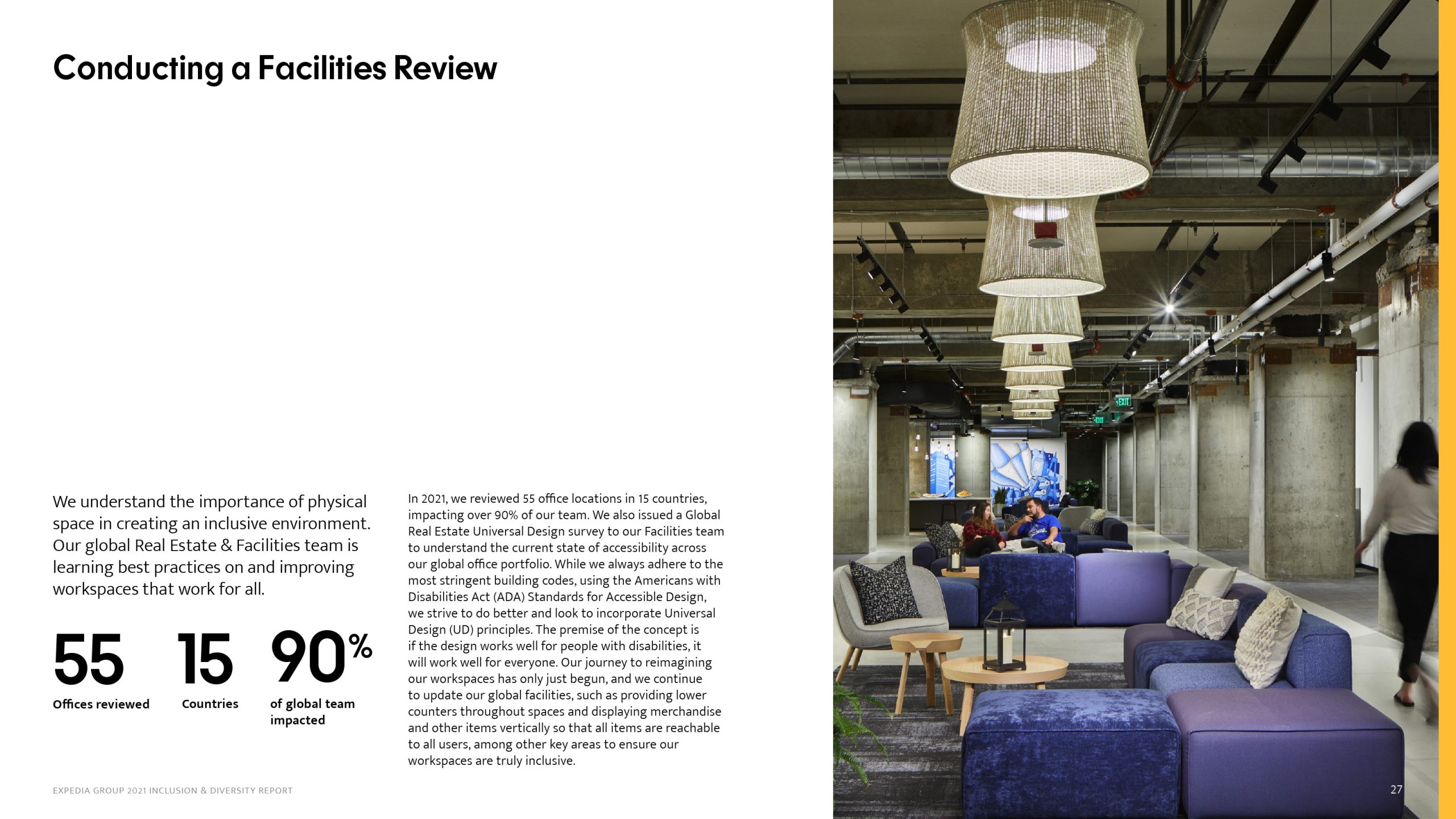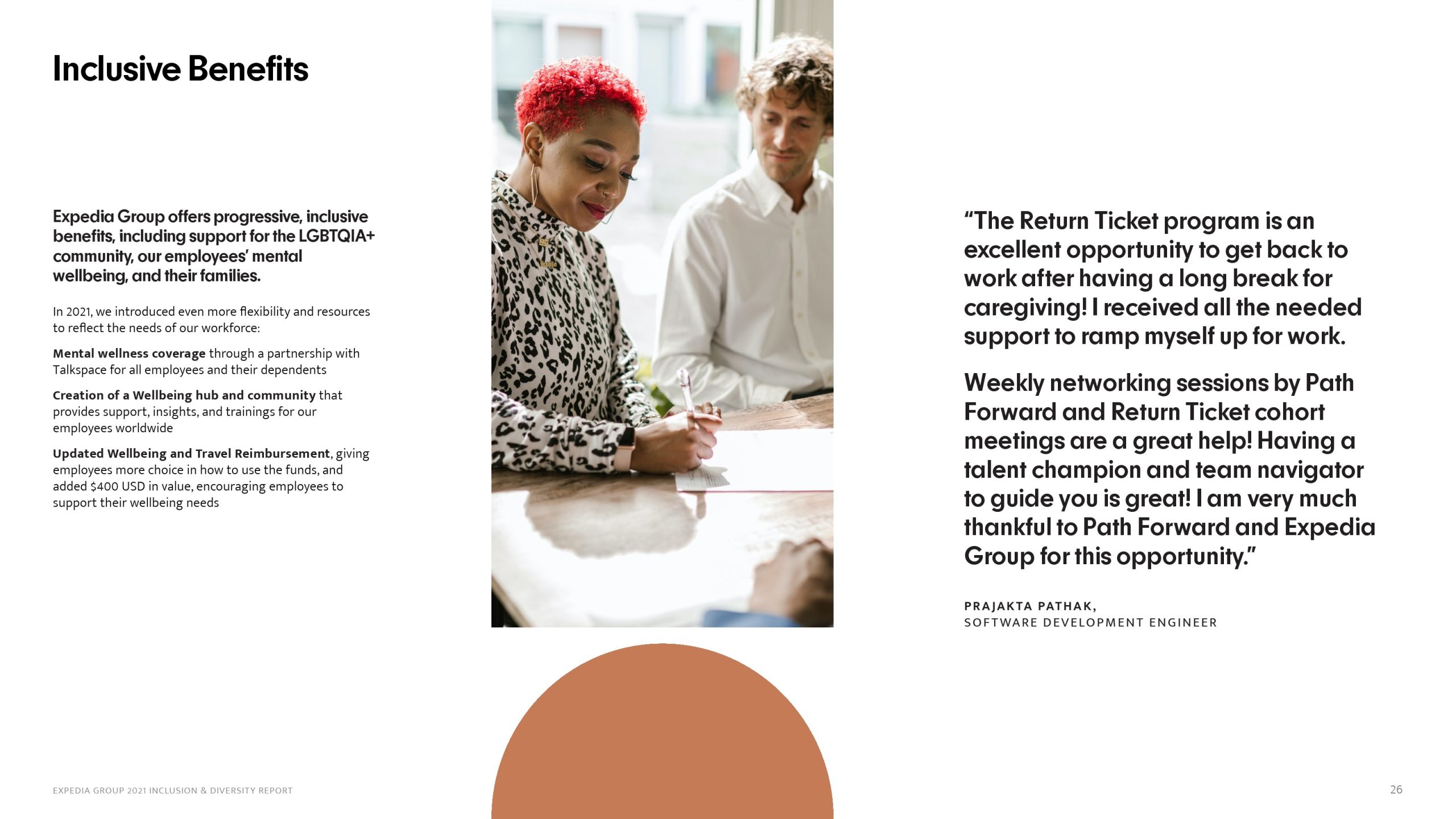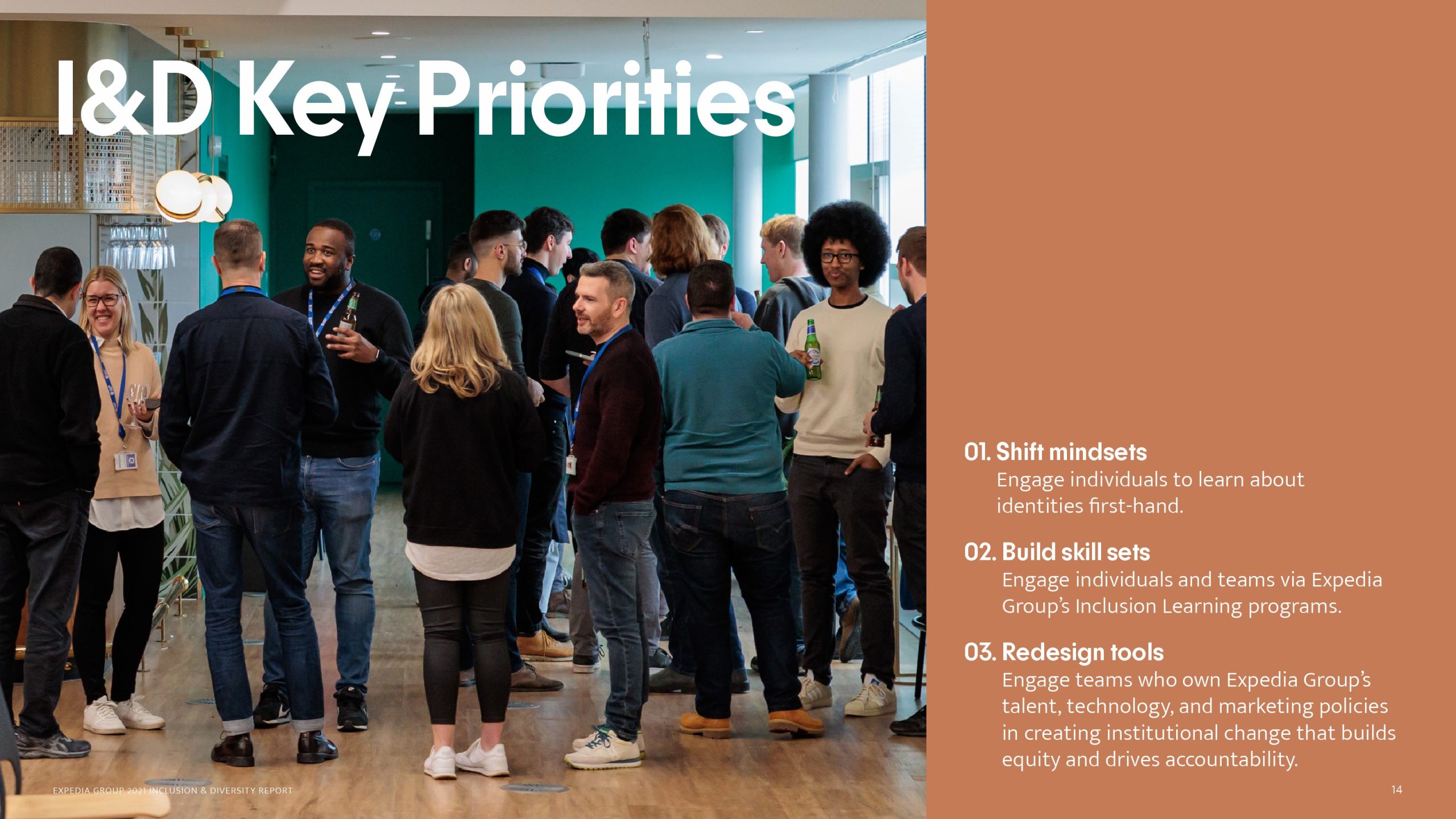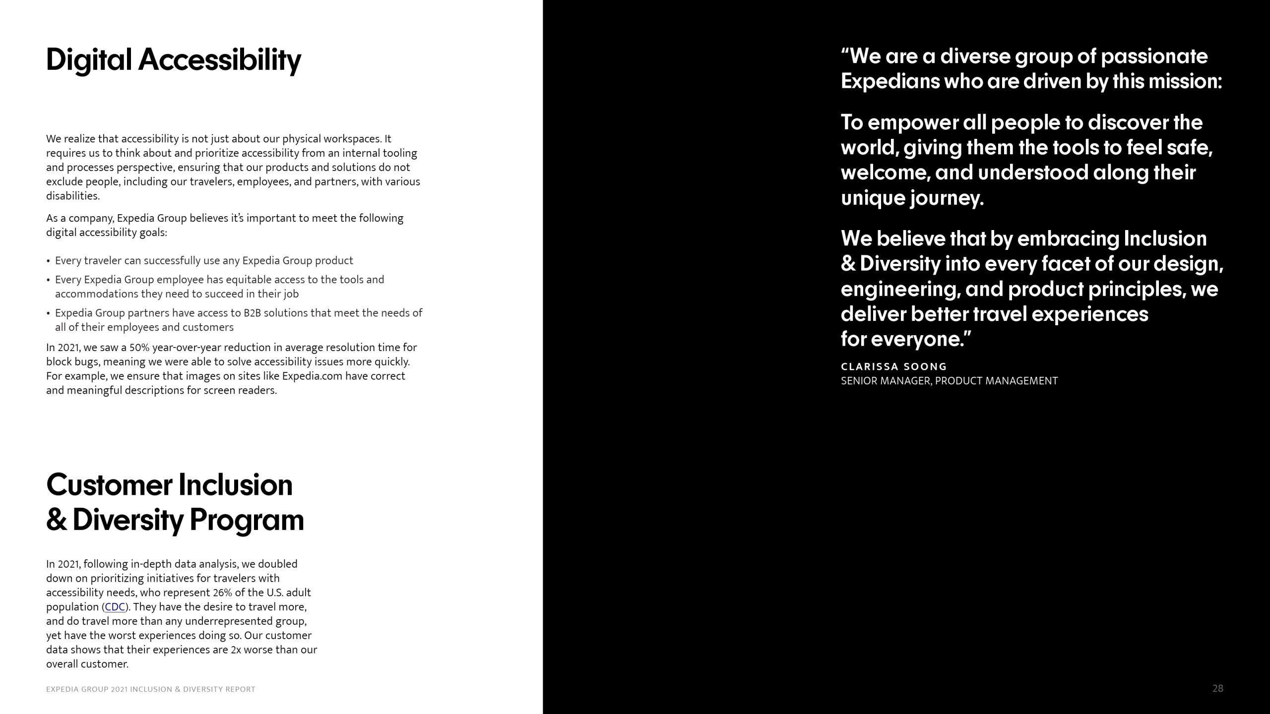 我们设定了一个二元性别目标,即到2025年底在 Expedia Group 的所有级别上达到50/50的平衡,并宣布到2021年底,25%的外部员工将来自种族和民族代表性不足的群体(URI)。具体来说,包括非州裔美国人、拉丁裔、两个或更多种族、美洲印第安人、夏威夷原住民和其他太平洋岛民。