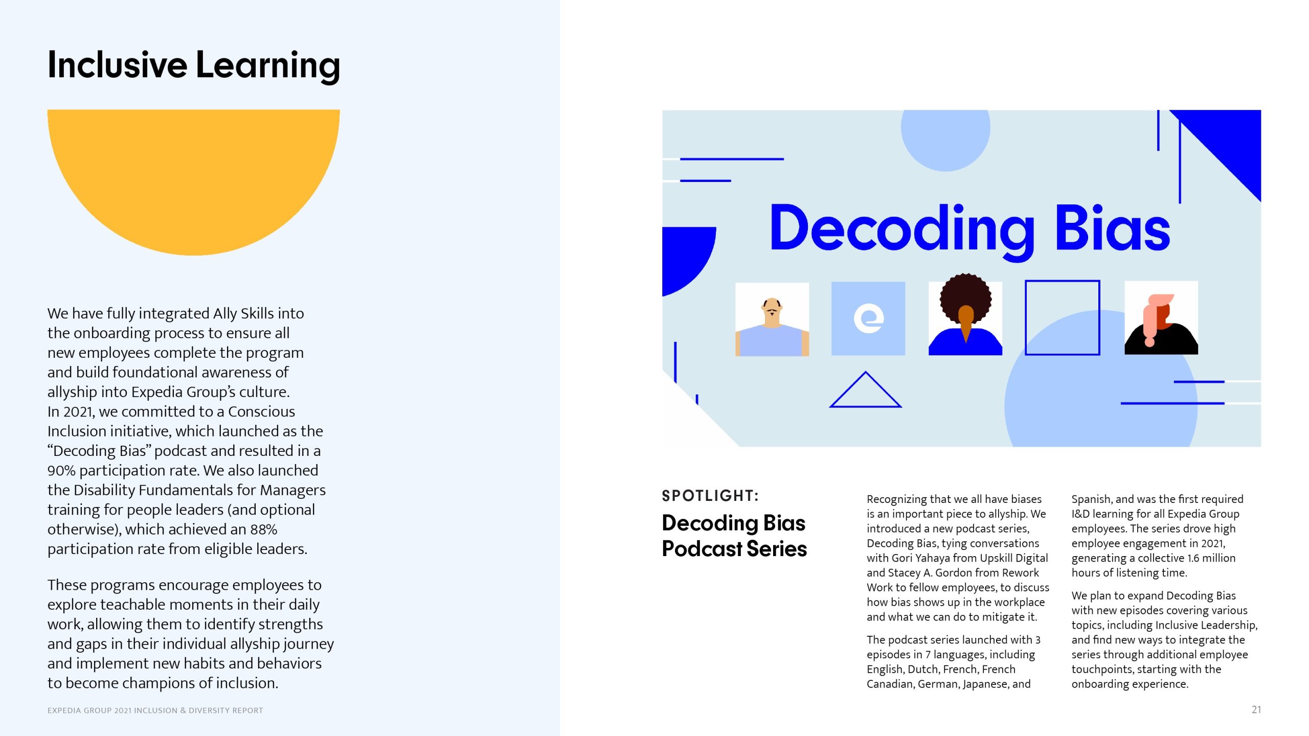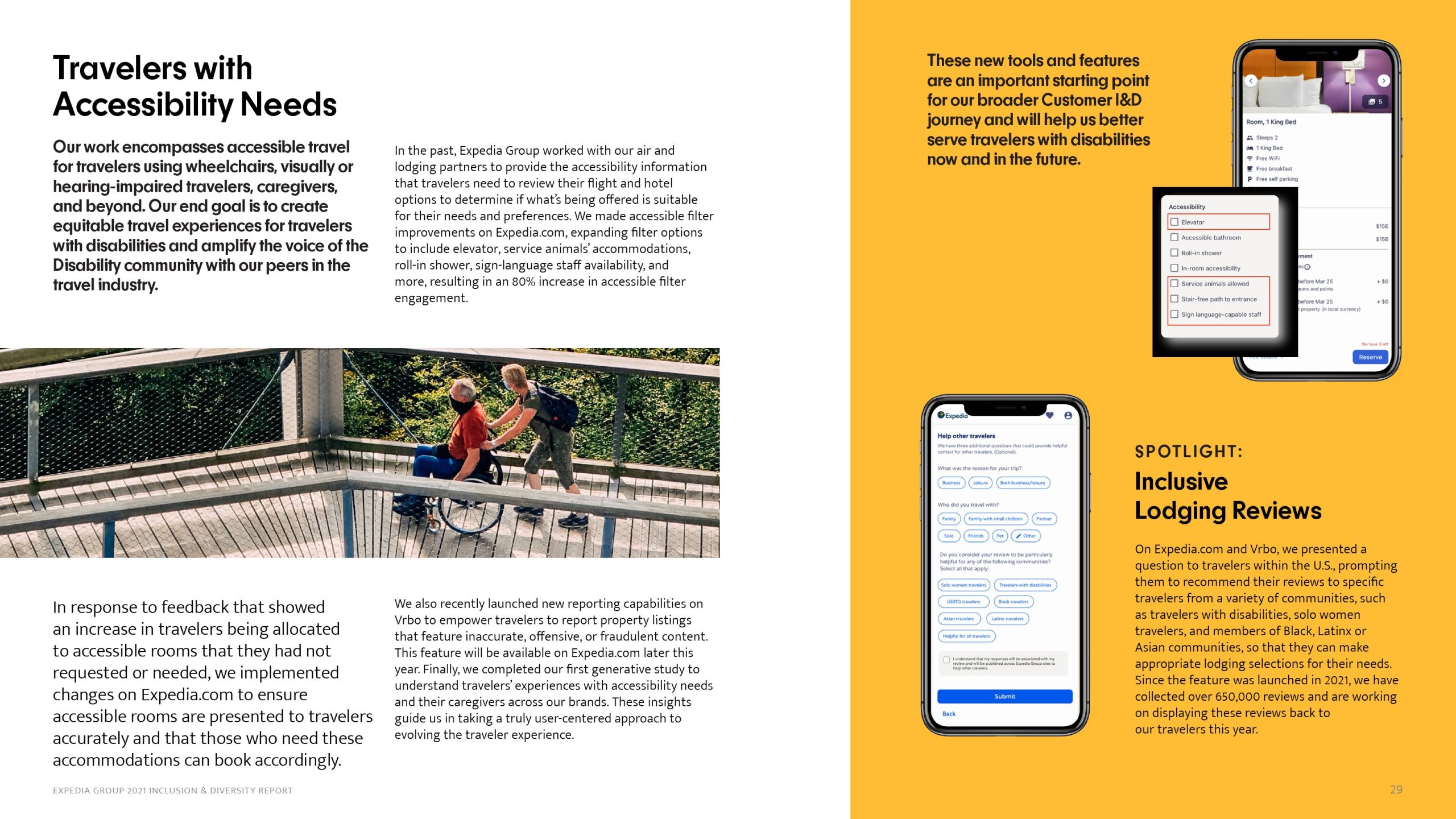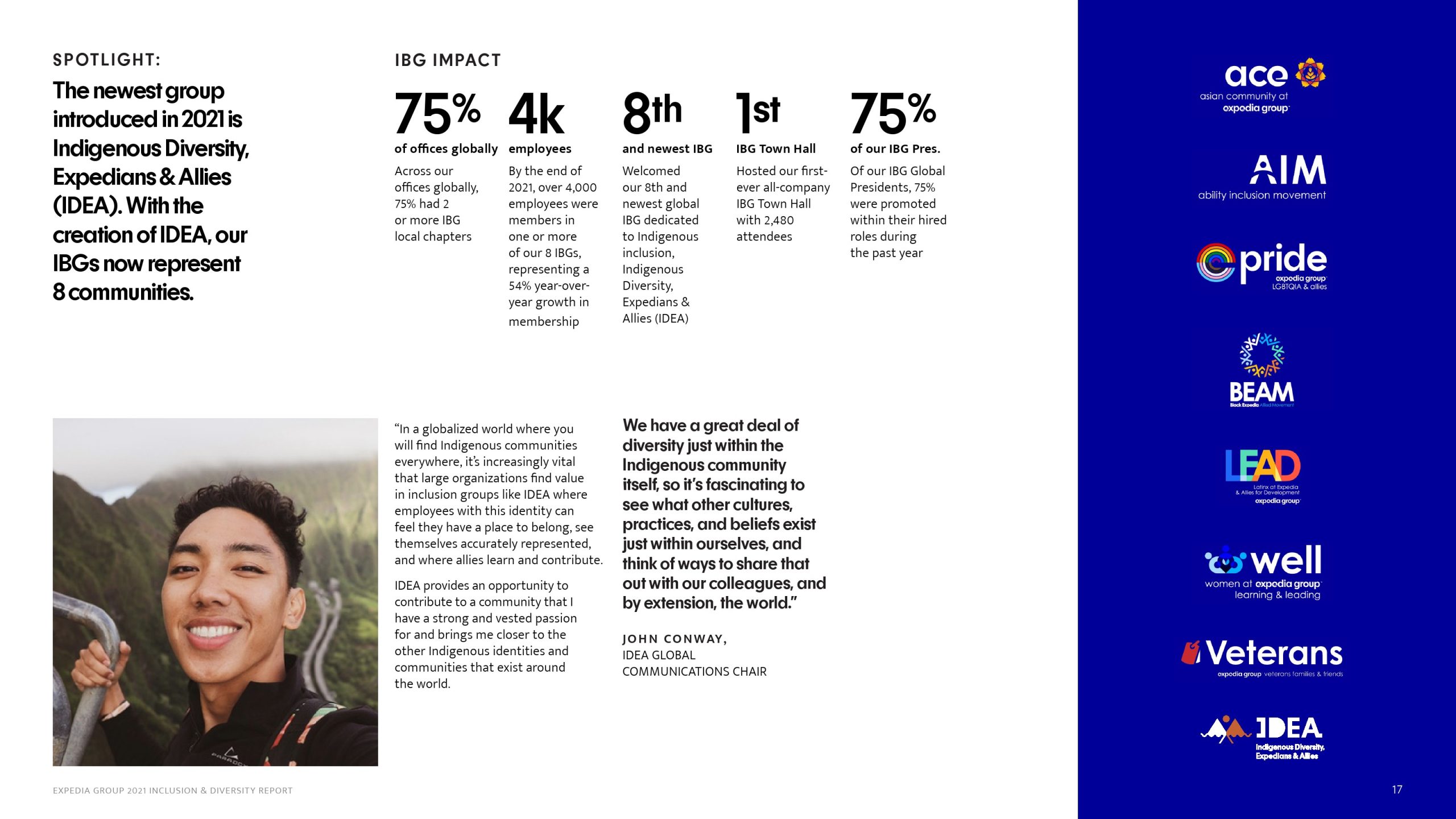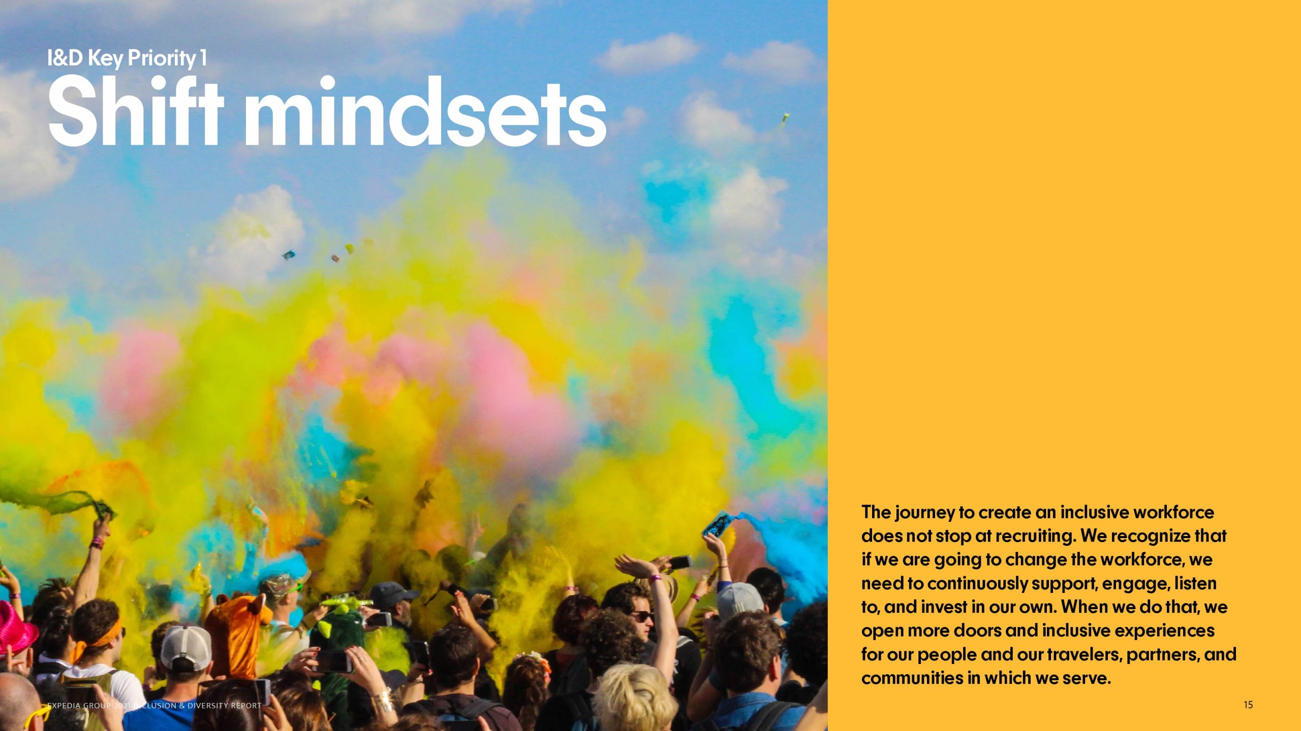 我们设定了一个二元性别目标,即到2025年底在 Expedia Group 的所有级别上达到50/50的平衡,并宣布到2021年底,25%的外部员工将来自种族和民族代表性不足的群体(URI)。具体来说,包括非州裔美国人、拉丁裔、两个或更多种族、美洲印第安人、夏威夷原住民和其他太平洋岛民。