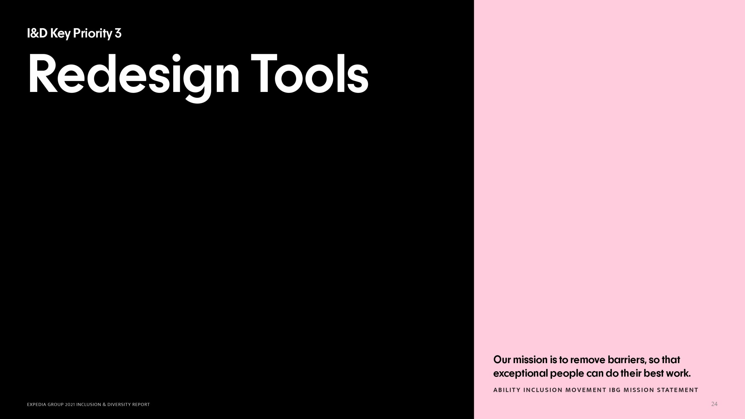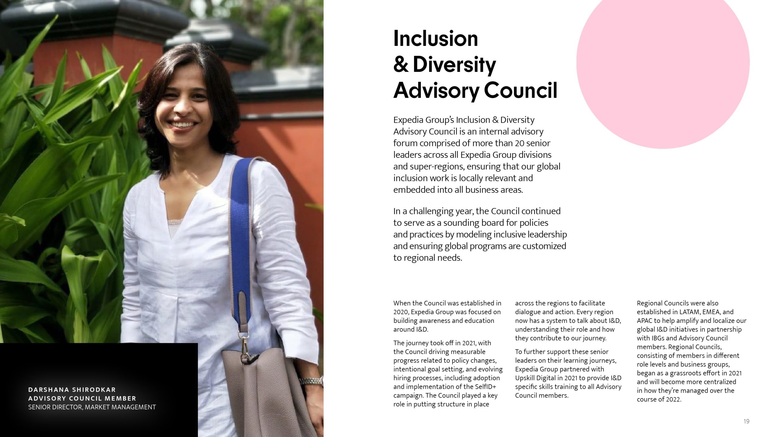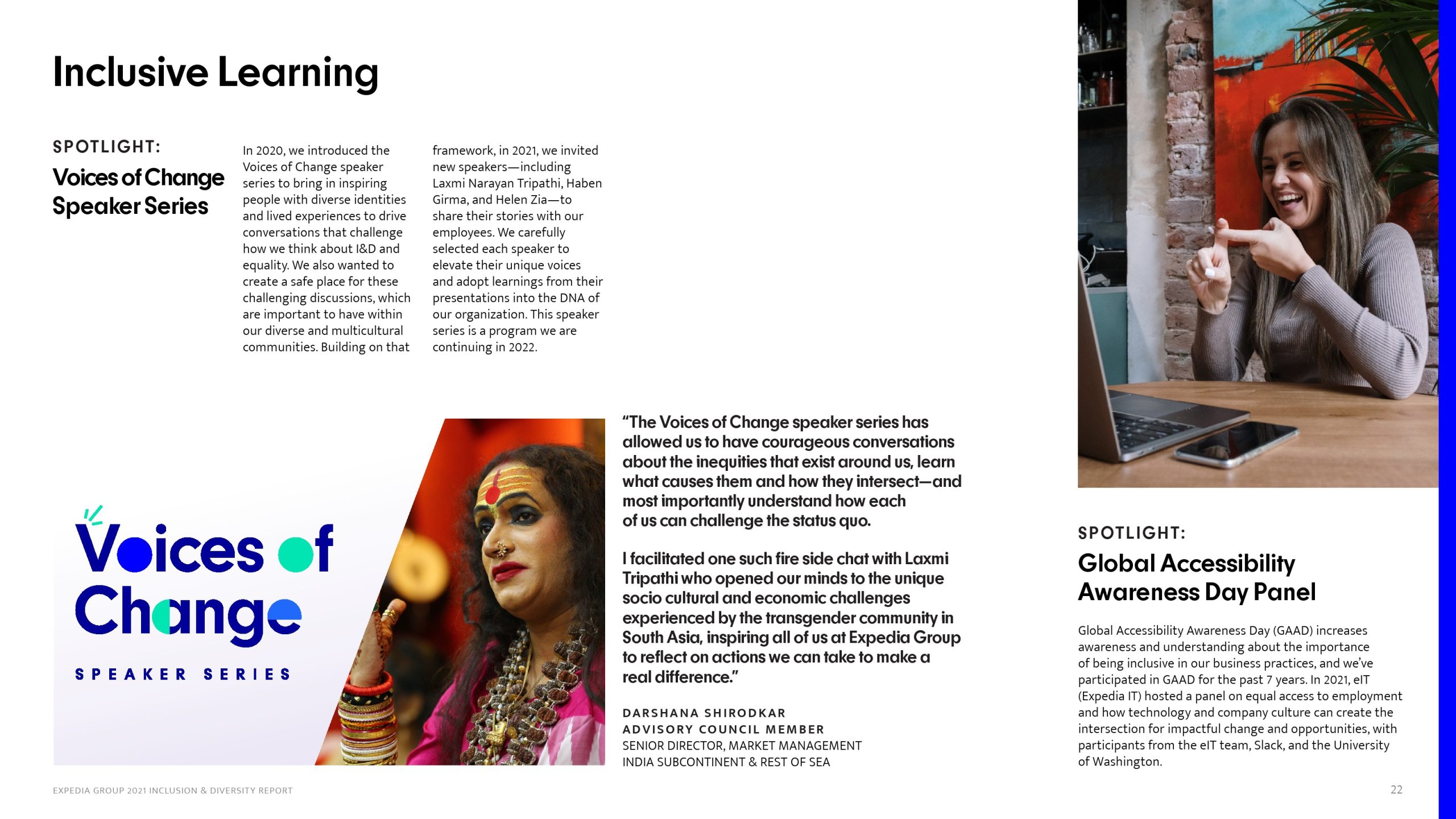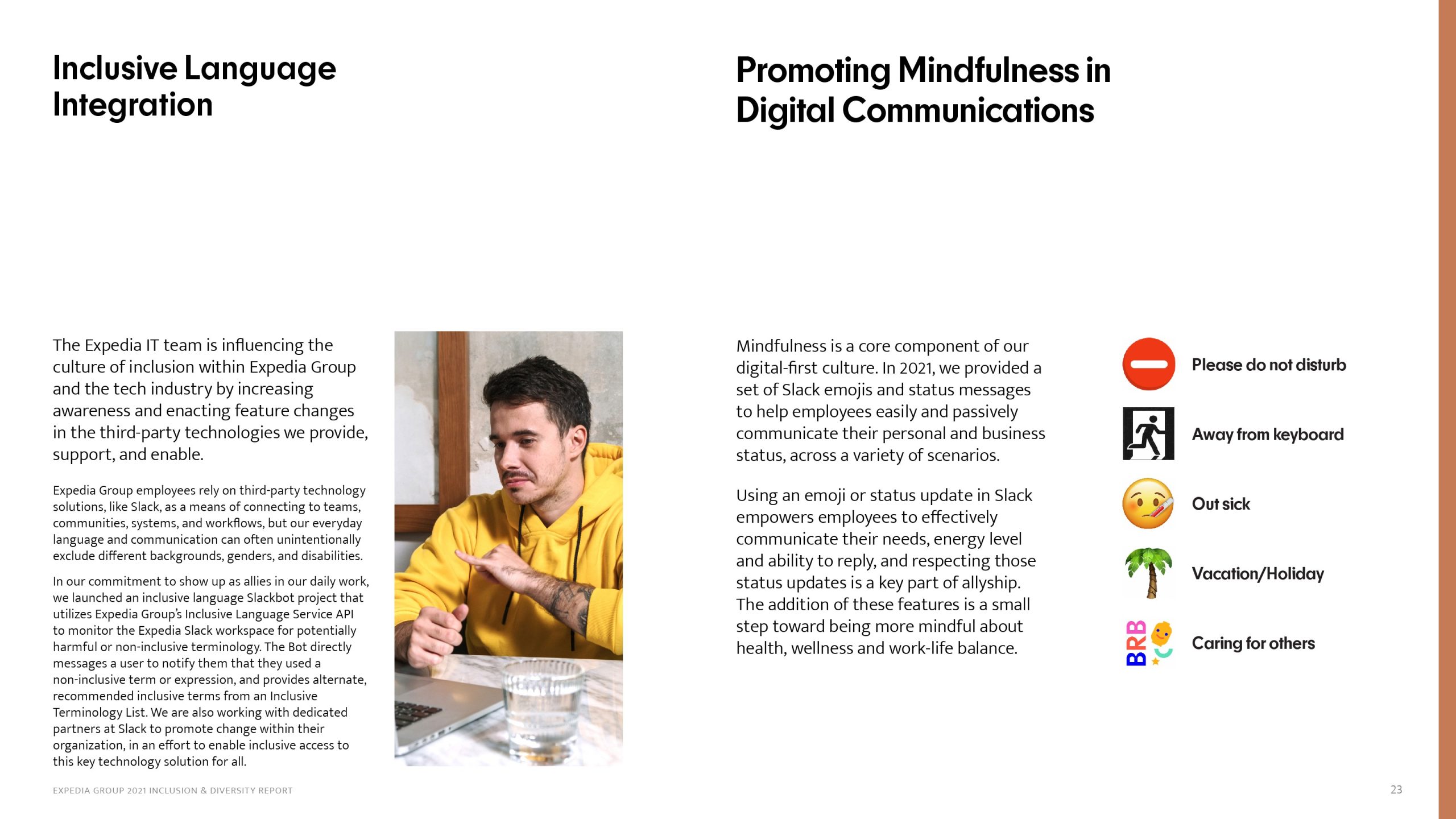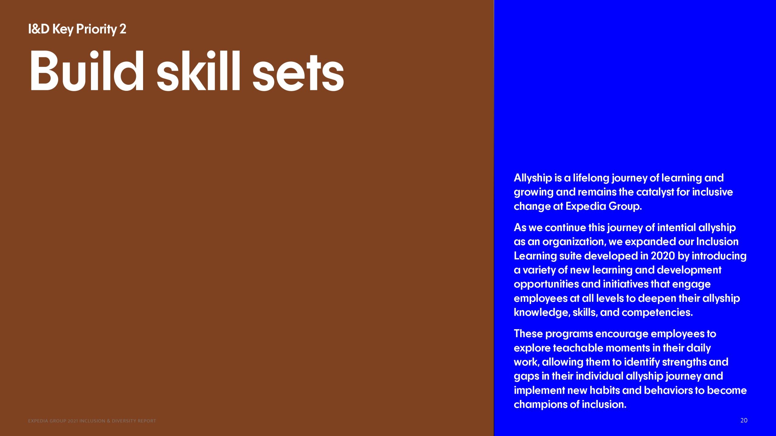 我们设定了一个二元性别目标,即到2025年底在 Expedia Group 的所有级别上达到50/50的平衡,并宣布到2021年底,25%的外部员工将来自种族和民族代表性不足的群体(URI)。具体来说,包括非州裔美国人、拉丁裔、两个或更多种族、美洲印第安人、夏威夷原住民和其他太平洋岛民。