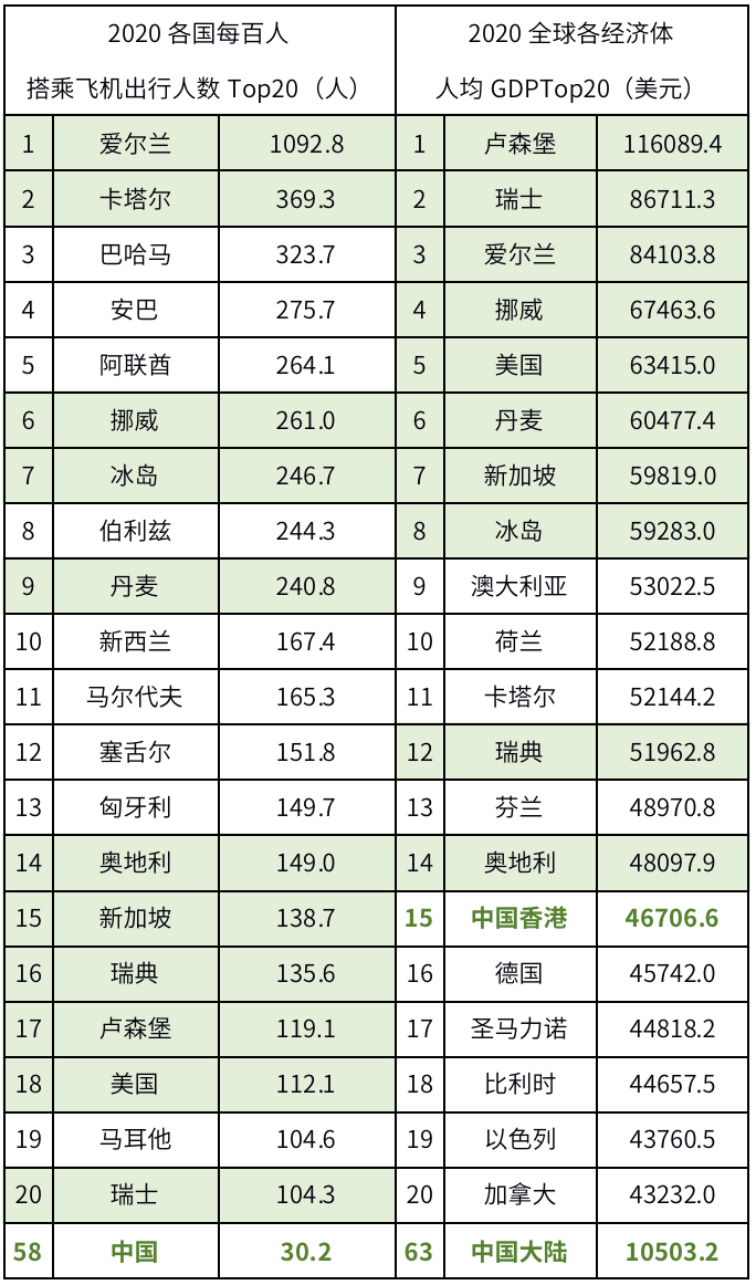 事实上,根据民航组织发布的《2020年世界民航航空统计》,我国每百人搭乘飞机出行的人数只有30.2,全球排名第58,而排第一的爱尔兰高达1092.8,美国为112.1。