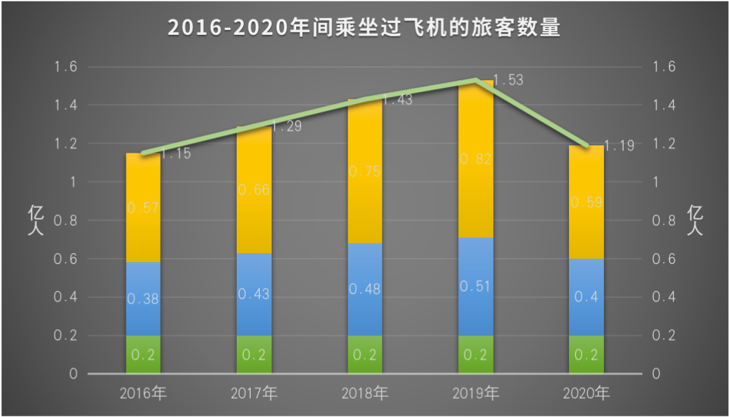 根据航旅纵横的大数据,2016-2020年民航运输旅客人数(不是人次)分别为1.15亿、1.29亿、1.43亿、1.53亿、1.19亿。