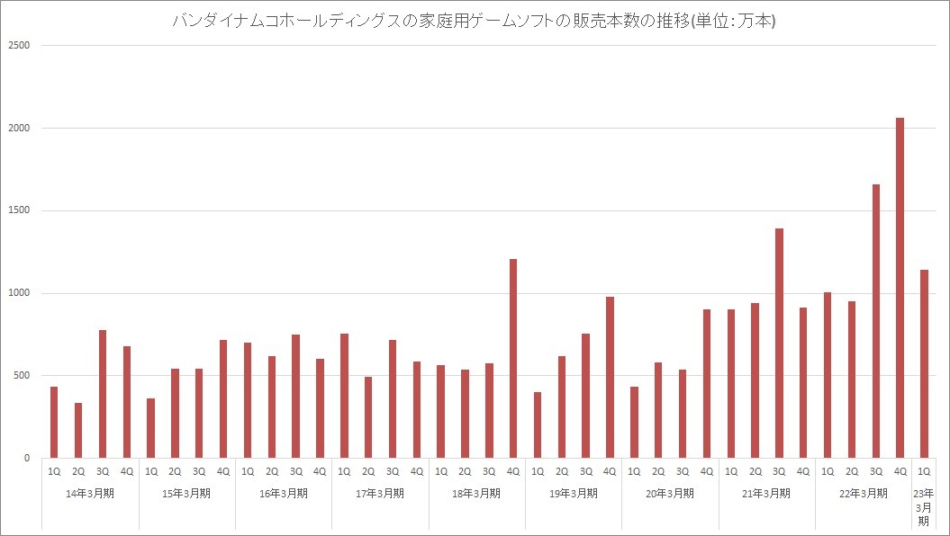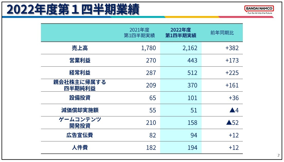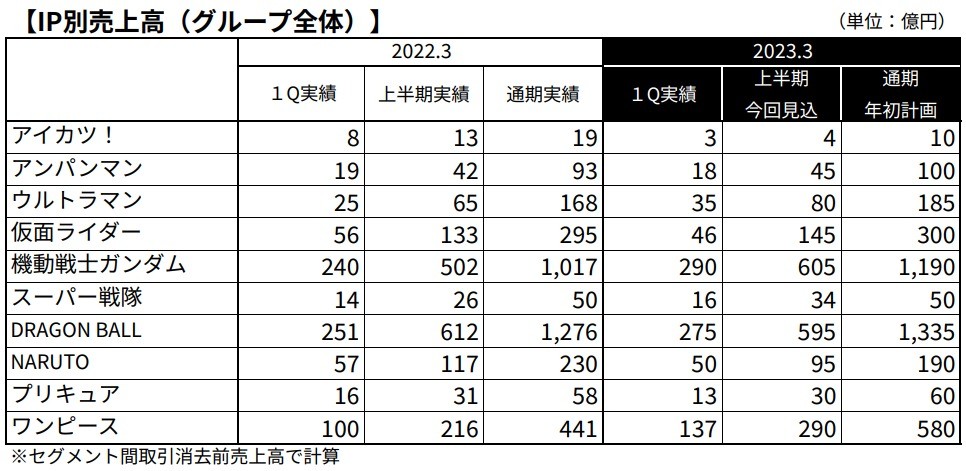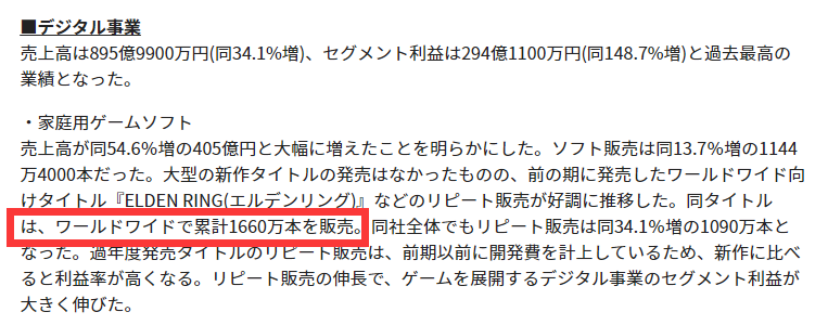 业绩的上涨来自游戏业务的销售的强劲势头,其中《艾尔登法环》最为突出,而其他IP如《偶像大师》《龙珠》《海贼王》等系列都有着不错的贡献。