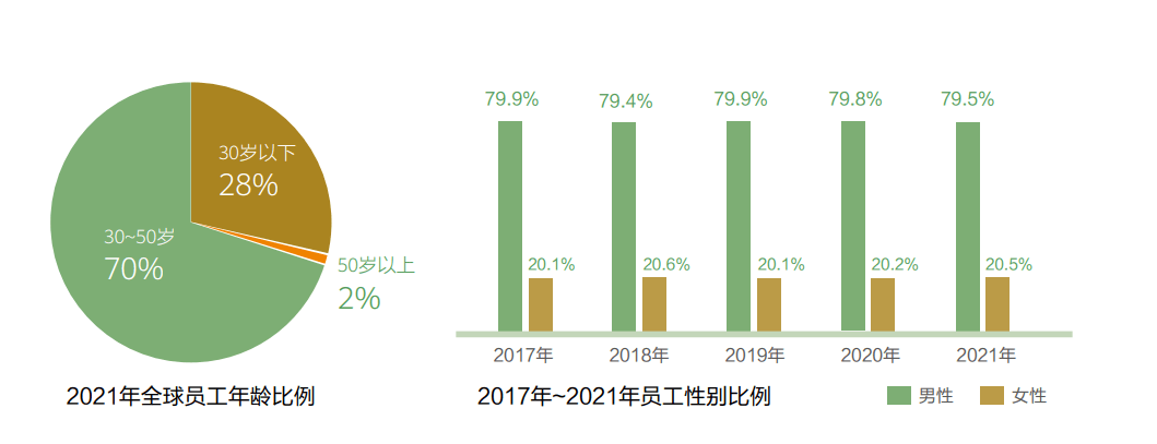 5月,腾讯也发布《腾讯可持续社会价值报告2021》,介绍腾讯员工年龄、性别构成。