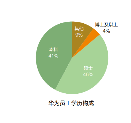 近日,华为在《2021年可持续发展报告》中,披露了员工年龄比例、性别比例、学历构成等数据。 关于性别比例,2021年华为男性员工占比79.5%,女性员工占比20.5%。 学历构成上,华为员工硕士学历占比最高,达到46%,本科学历占比41%,博士及以上占比4%,其他占比9%。