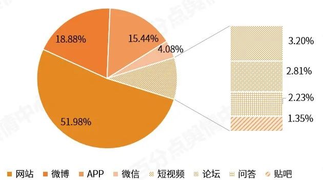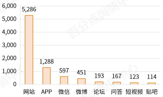 从分布渠道来看,舆情声量主要集中在网站、APP、微信、微博等平台,其中网站声量占比最高。