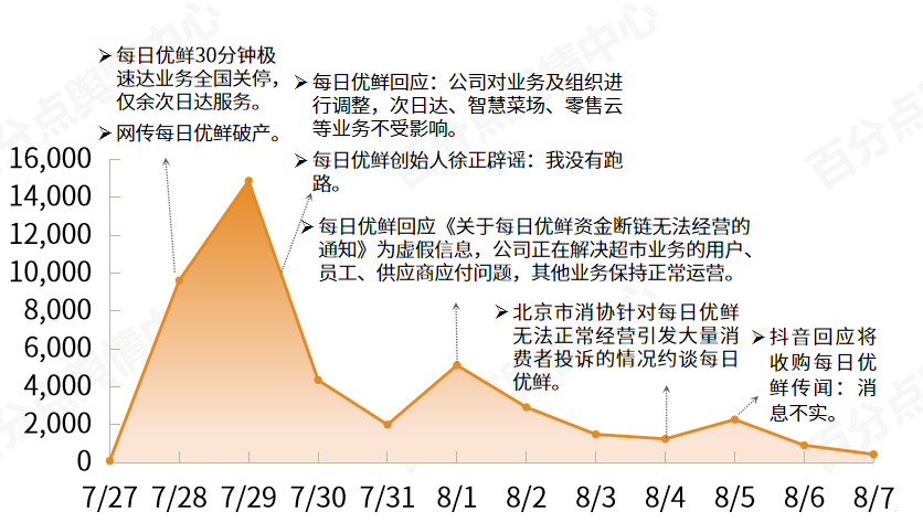 7月28日,每日优鲜在 App 首页发布服务变更通知:每日优鲜配送时间由原来的最快 30 分钟送达变为最快次日送达,配送范围为全国均可配送。随后,“公司原地解散”、“融资未交割成功”、“拖欠供应商贷款”、“员工断缴社保拖欠工资”等消息相继登上新闻。