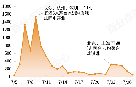 5月底,茅台与蒙牛联合跨界推出了茅台冰淇淋,首发当天,i茅台App上51分钟售出超过4万个预包装冰淇淋,销售额约250万元。7月9日,长沙、杭州、深圳、广州、武汉5家茅台冰淇淋旗舰店同步开业。7月23日,北京、上海居民可通过i茅台云购茅台冰淇淋。至此,茅台冰淇淋已覆盖九个省、市。
