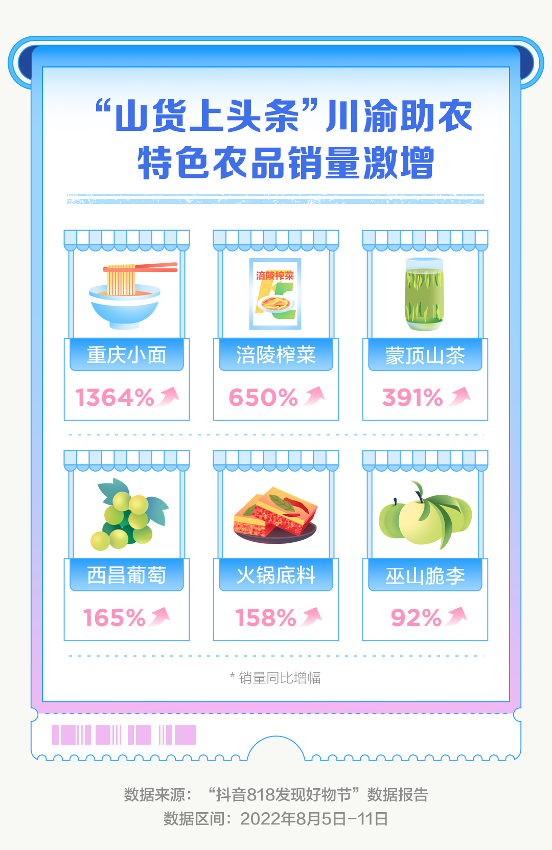 除了助力国潮好物拓展市场,该平台“山货上头条”助农项目还在活动期间深入川渝,推广当地农特产。报告显示,8月5日至11日,重庆小面销量同比增长高达1364%,涪陵榨菜、 蒙顶山茶、 西昌葡萄等地方农品也实现了销量翻番。