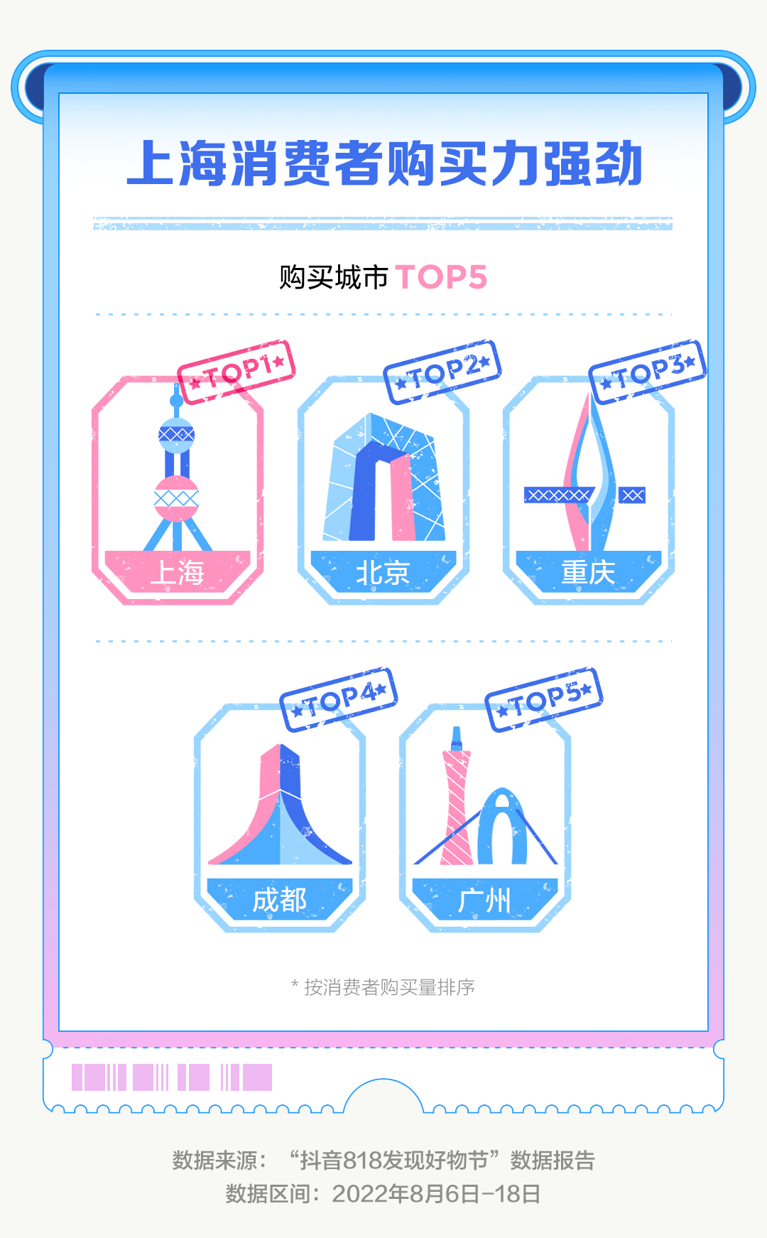从地域来看,“抖音818发现好物节”期间,上海消费者购买力最为强劲。北京、重庆、成都和广州消费者紧随其后。