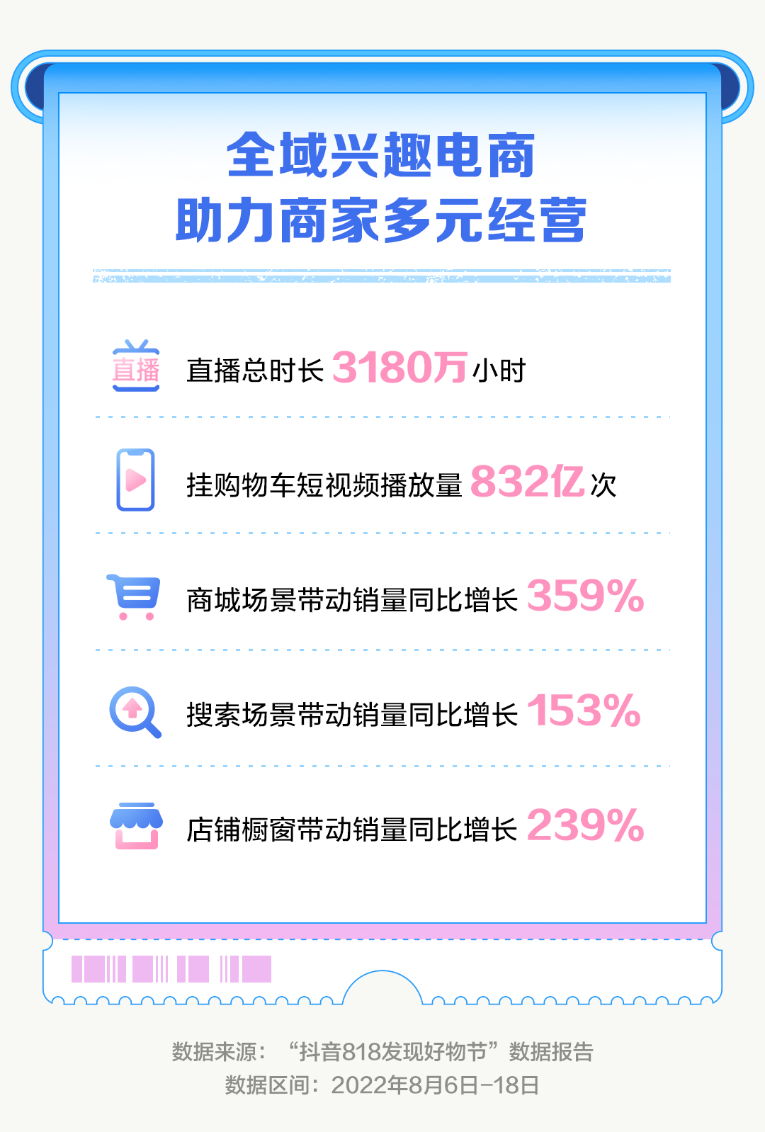 抖音电商发布“抖音818发现好物节”数据报告,展现活动期间该平台销售趋势及消费者偏好。报告显示,8月6日至18日,抖音电商直播时长累计达3180万小时,挂购物车的短视频播放了832亿次。