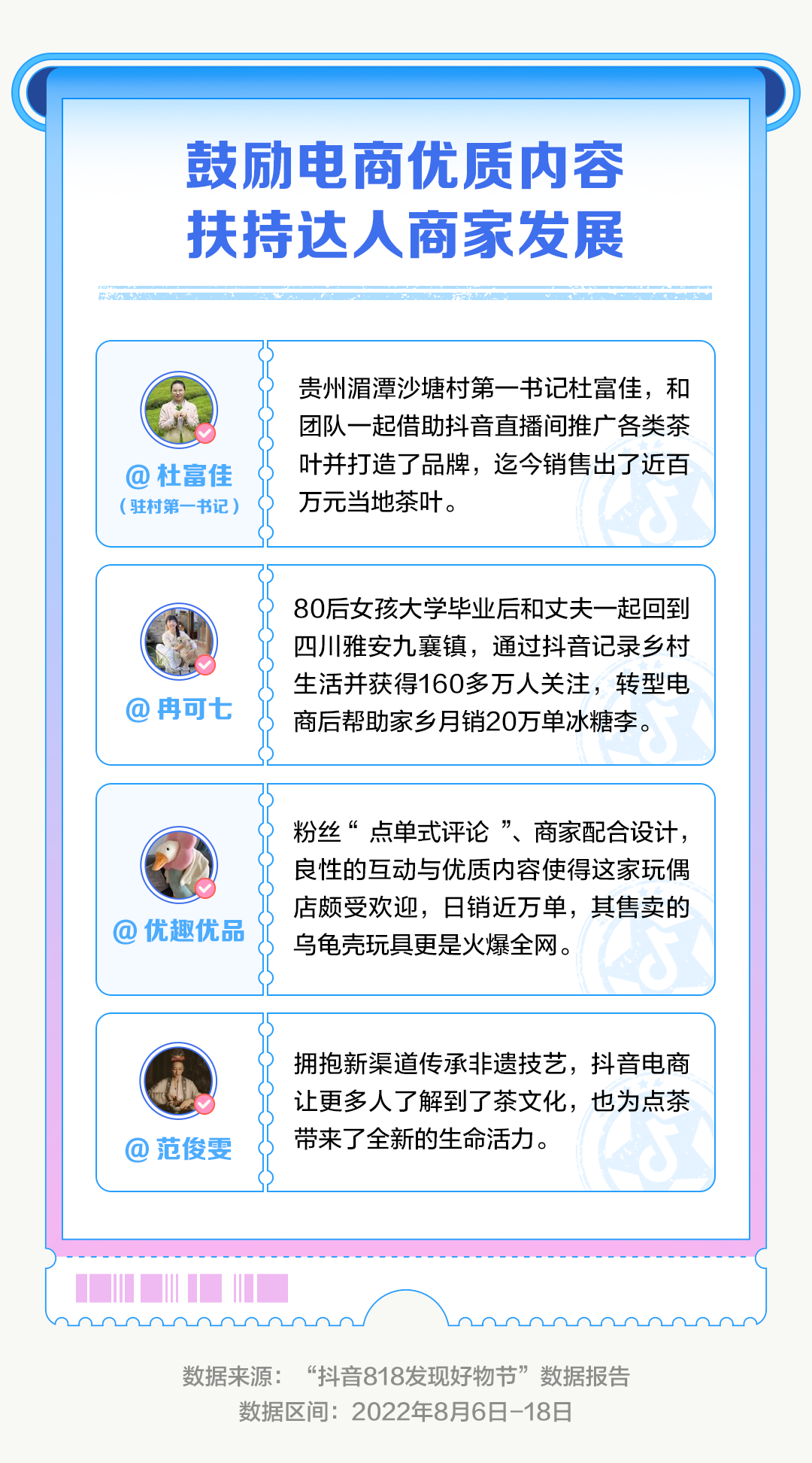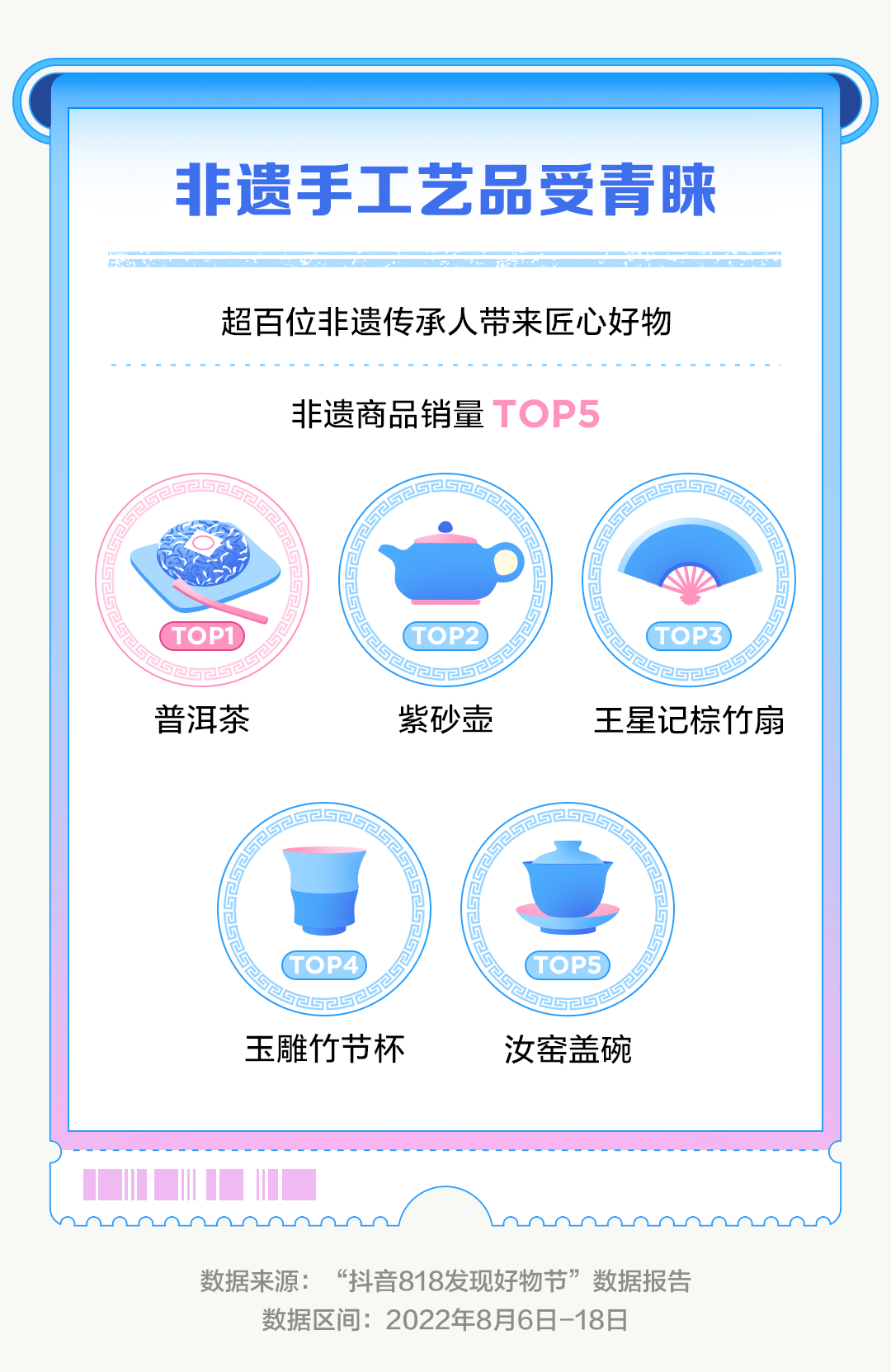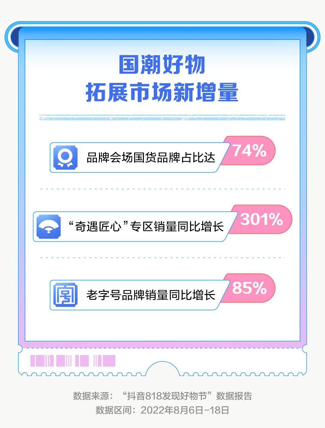 本次“抖音818发现好物节”还特别上线了“奇遇匠心”专区,关注买卖背后的社会价值创造,推介非遗商品等匠心好物。据统计,活动期间该专区销量同比增长301%。