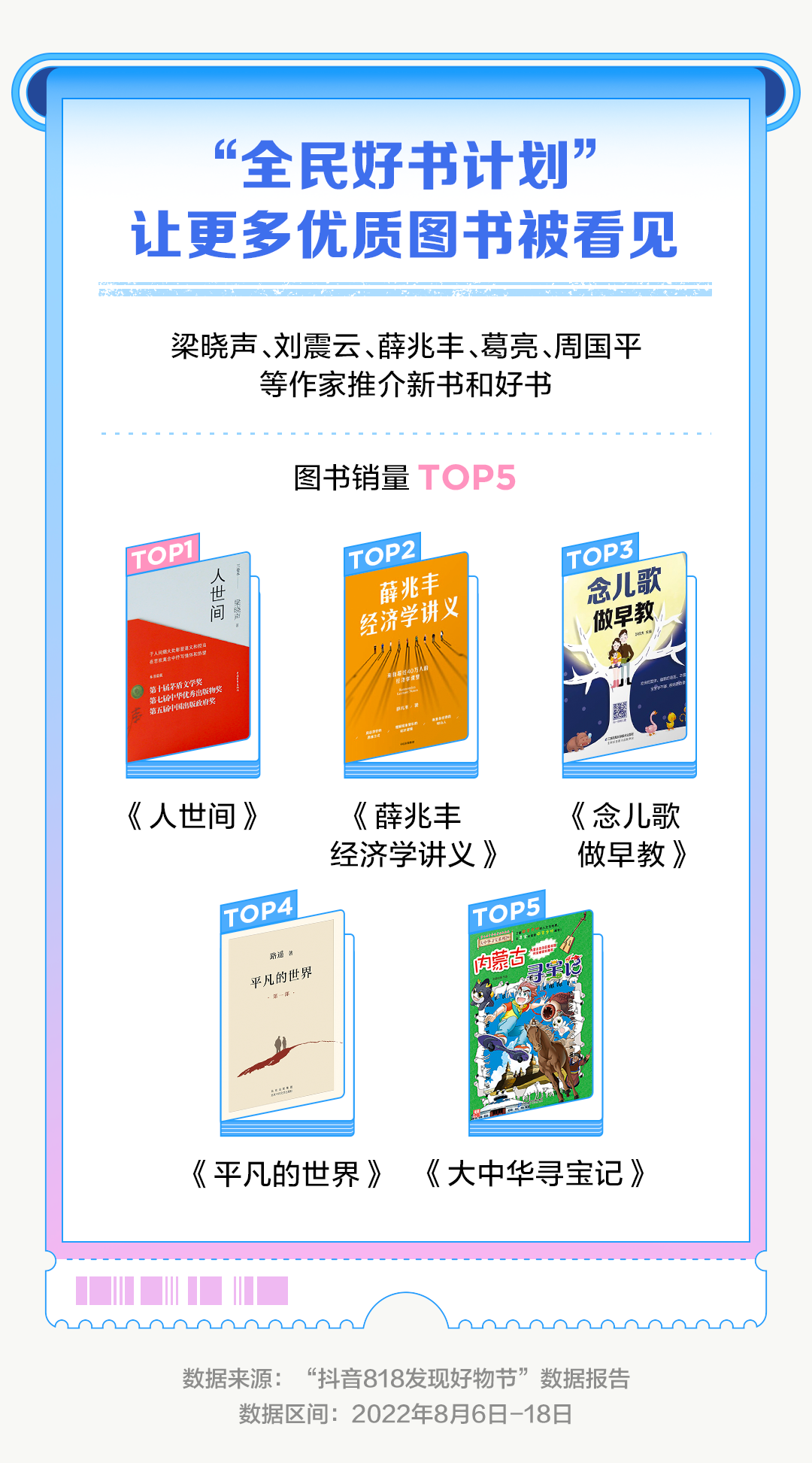 在“全民好书计划”的推动下,各类图书在活动中销售火热。梁晓声、刘震云、薛兆丰、葛亮、周国平等作家纷纷通过该平台推介新书和好书。报告显示,8月6日至18日,《人世间》《薛兆丰经济学讲义》《念儿歌做早教》《平凡的世界》和《大中华寻宝记》位列图书销量榜前五。