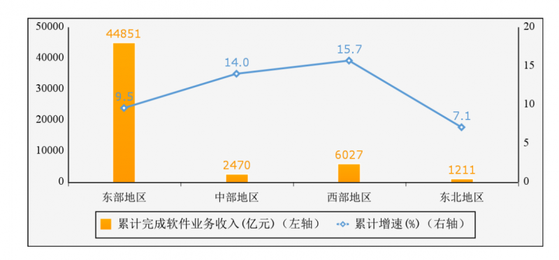 东部地区软件业务收入增速有所回落,西部地区增势领先。1—7 月份,东部地区完成软件业务收入 44851 亿元,同比增长 9.5%,增速较上半年回落 0.7 个百分点;中部地区完成软件业务收入 2470 亿元,同比增长 14.0%,高出全行业整体增速 3.7 个百分点;西部地区完成软件业务收入 6027 亿元,同比增长 15.7%,高出全行业整体增速 5.4 个百分点;东北地区完成软件业务收入 1211 亿元,同比增长 7.1%,增速较上半年提高 0.8 个百分点。四个地区软件业务收入在全国总收入中的占比分别为 82.2%、4.5%、11.0% 和 2.2%。