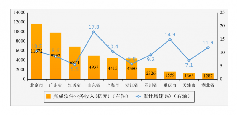 主要软件大省收入占比小幅回落。1—7 月份,软件业务收入居前 5 名的省份中,北京市、广东省、江苏省、山东省、上海市软件收入分别为 11672 亿元、9792 亿元、6871 亿元、4937 亿元和 4415 亿元,分别增长 10.5%、8.6%、5.5%、17.8% 和 10.4%,五省(市)合计软件业务收入 37687 亿元,占全国比重为 69.1%,占比较去年同期回落 0.2 个百分点。