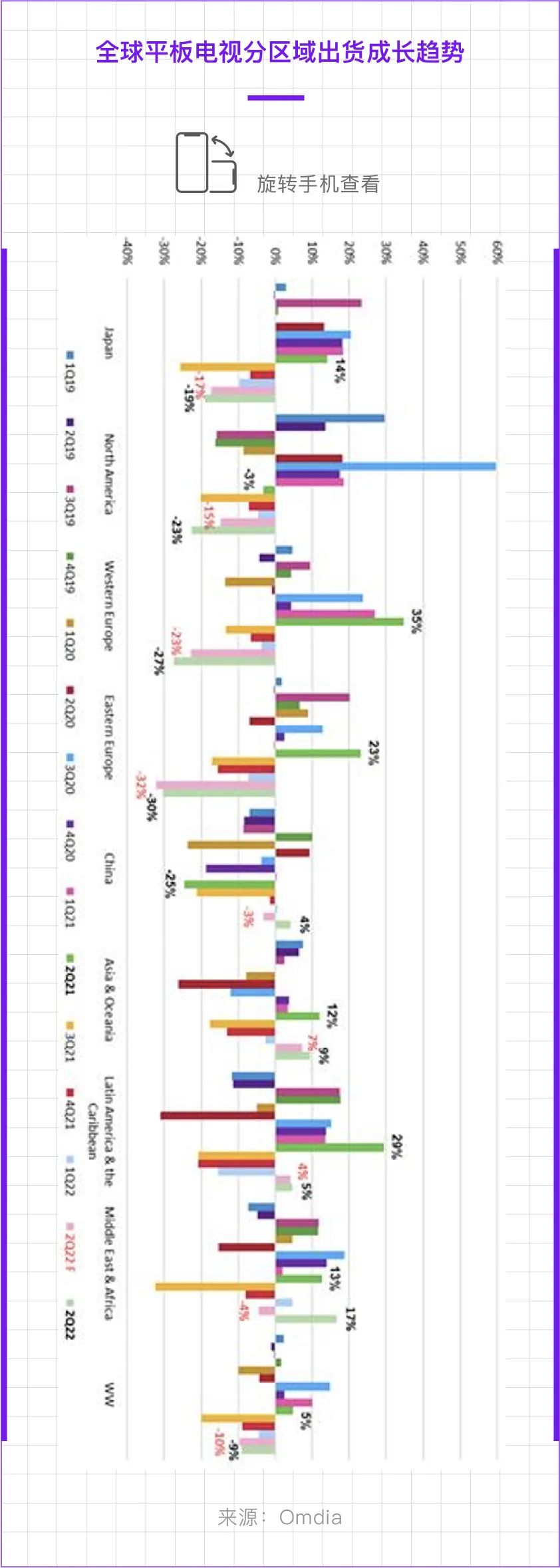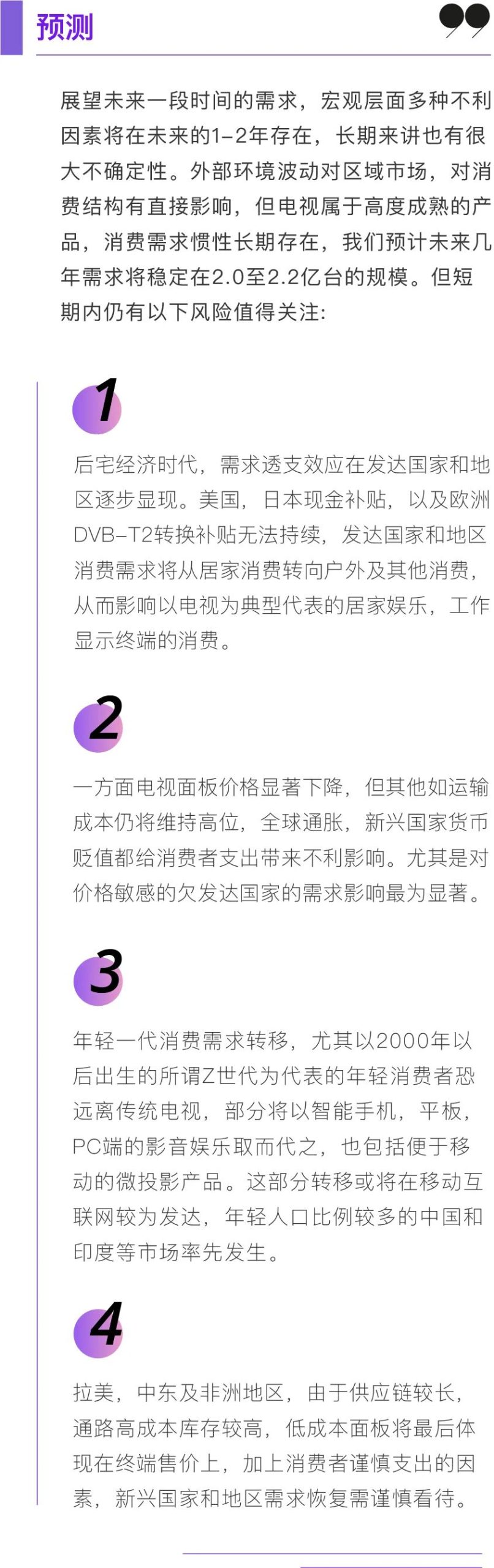 单第二季度而言,全球电视出货为4353万台,环比减少11.3%,同比下降9.0%。上半年及第二季度均创历史新低,但也基本符合预期。这主要是因为欧美及日本发达国家和地区市场需求透支效应逐步显现,加上高通胀带来购买力下降;而发展中国家有一定恢复性成长,但因为基数低,对全球市场的成长贡献有限,无法扭转今年上半年电视出货低迷的状况。预计下半年全球电视市场环境并未有根本性的转折,电视出货需求将持续低迷。