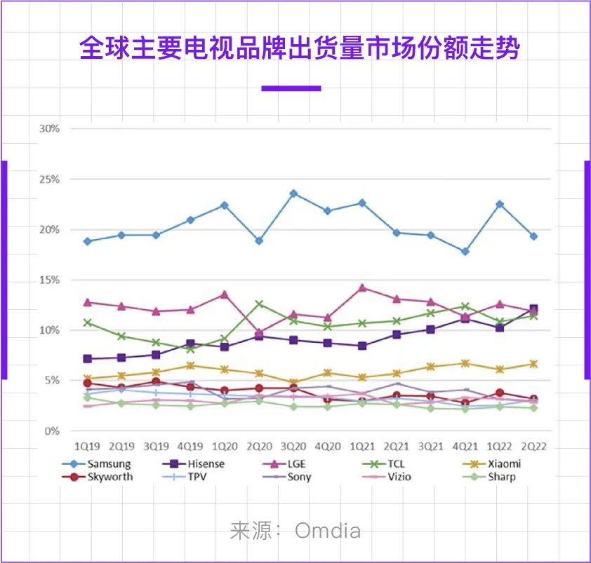 从品牌竞争格局来看,三星出货一直稳居第一,第二梯队竞争极为胶着,海信、LGE和TCL市场份额交替领先。特别的是,海信凭借其旗下东芝,以及VIDDAA在包括中国地区在内的全球市场都取得了一定的增量,在第二季度首次超越LGE和TCL,出货数量位居全球第二。