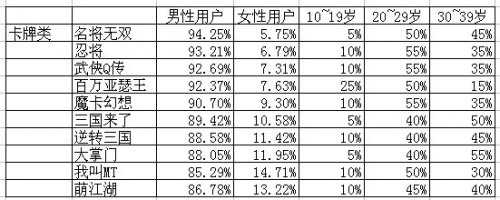 今天探讨的一个话题就是手机游戏的用户构成,我们今日通过百度搜索量数据显示的用户数据,依次大致按照 卡牌、MMO、休闲分类来做了一个排序,按照男女用户比例、年龄段分布拉出下面的3张图表,由于页游移植产品的搜索来源不全是手游因此未列入名单。总体看,题材决定了用户群的年龄段,美术风格也决定了用户年龄分布,越强调比分数、比数值的产品女性用户越少。
