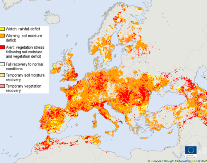 欧洲联盟委员会联合研究中心近日发布的一份报告显示,欧洲近三分之二地区发生干旱或面临干旱风险,部分地区旱情自8月以来持续恶化,已影响到内河航运、水力发电和农业收成。该联合研究中心的欧洲干旱观测网站根据降雨量、土壤湿度和植物光合作用吸收光能水平等数据评估干旱程度。