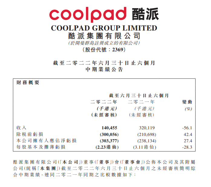 营收方面,酷派上半年营收1.405亿港元(约1.23亿元人民币),同比下降 56.1%;拥有人应占净亏损3.03亿港元(约2.64亿元人民币),同比扩大27.4%。