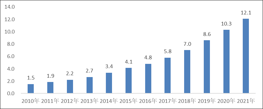 图表 1:2010 年 – 2021 年零售百强销售规模(万亿元)1