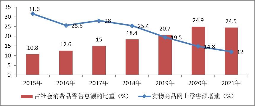 根据国家统计局数据,2021 年我国实物商品网上零售额为 10.8 万亿元,同比增长 12.0%,增速较上年放缓 2.8 个百分点,其占社会消费品零售总额的比重为 24.5%,较上年下降 0.4 个百分点。