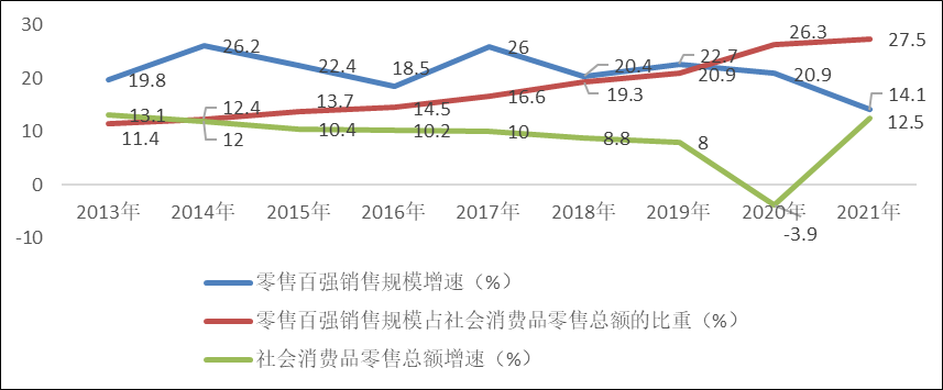 图表 2:2013 年 – 2021 年零售百强销售规模增速、社消增速及百强占社消比重
