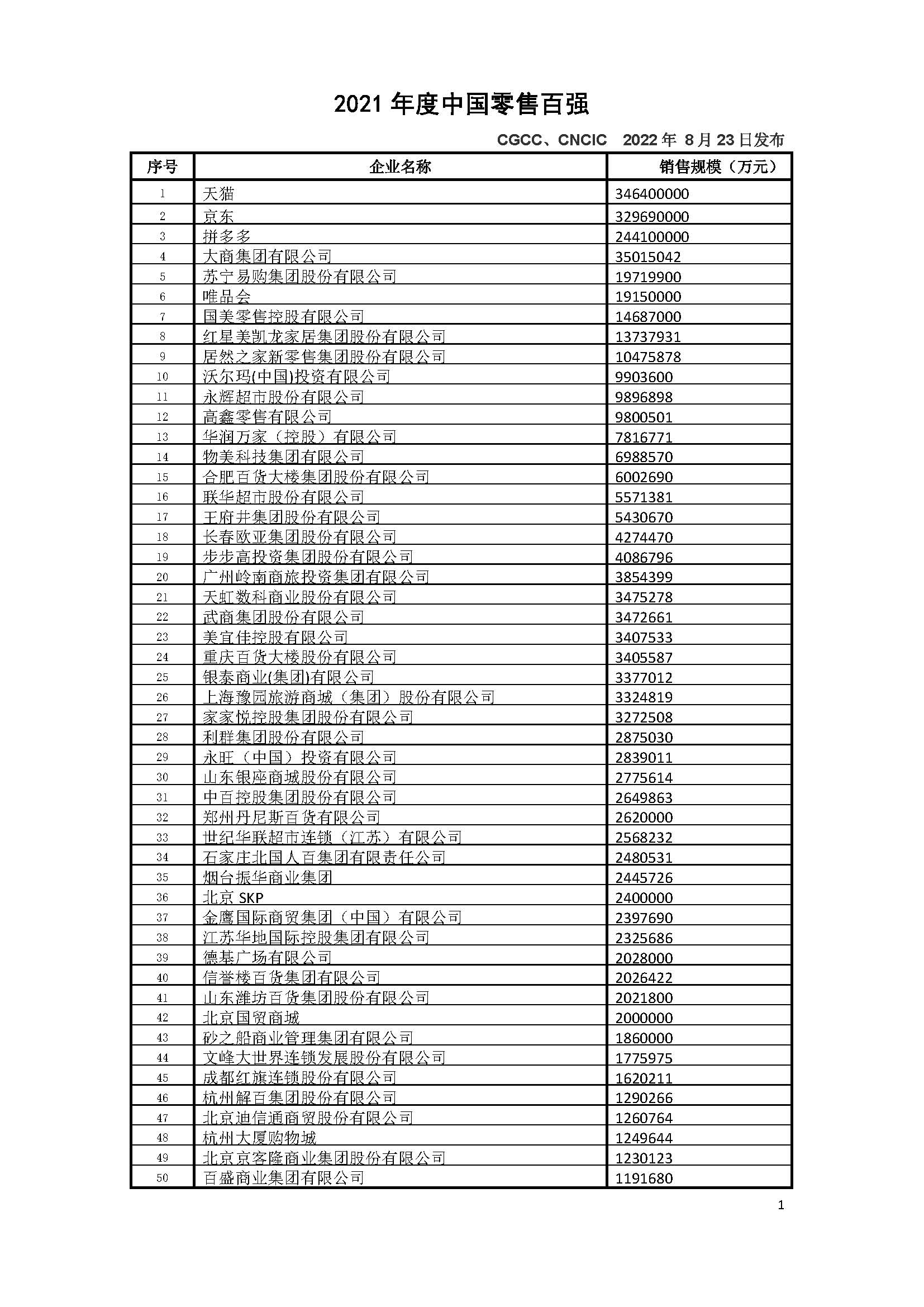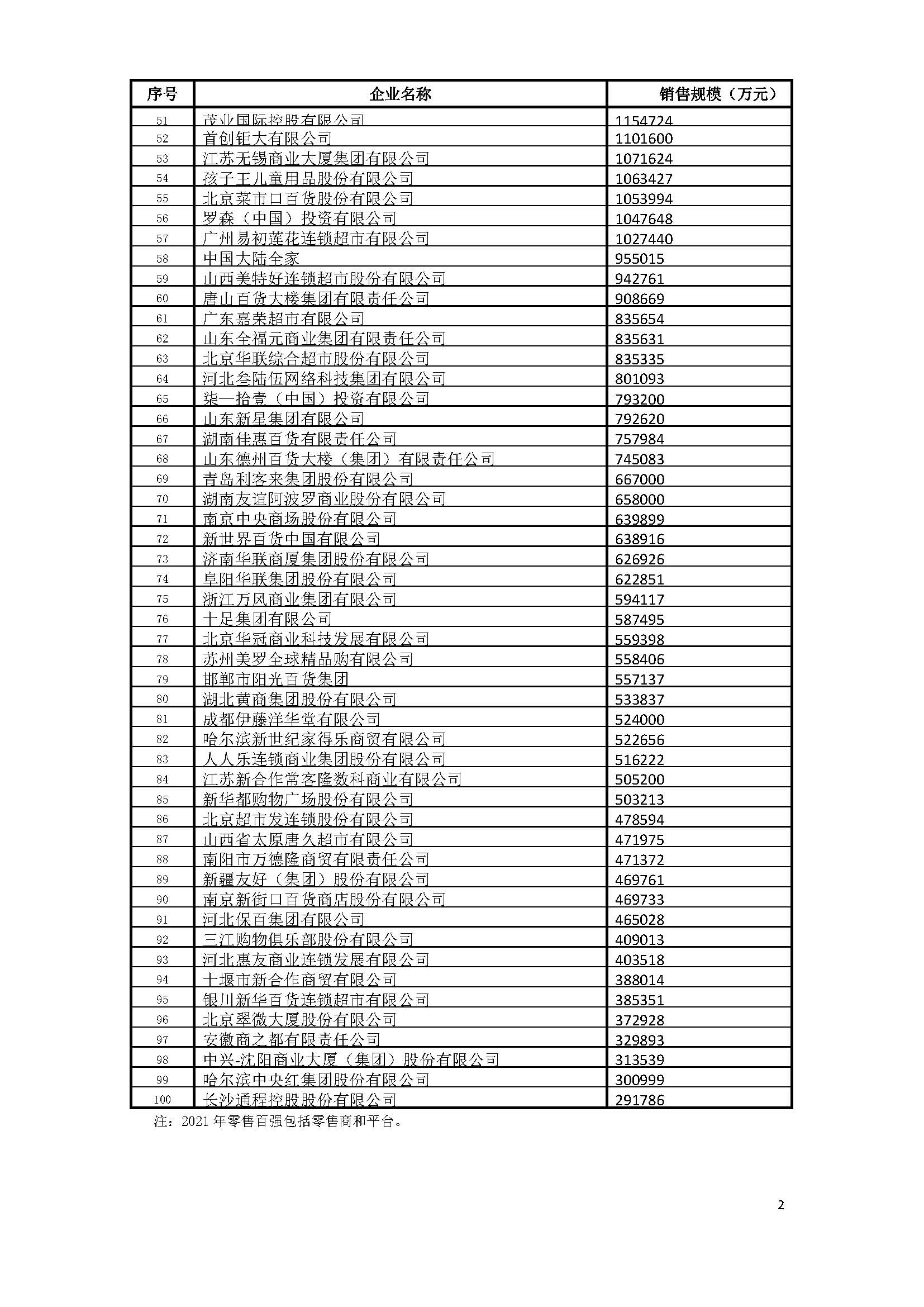 [1] 由于 2021 年度进入零售百强的企业相比上年有所变化,为保证本年数据与上年可比,计算零售业百强同比增长速度所采用的同期数与本期的企业统计范围相一致,和上年公布的数据存在口径差异。