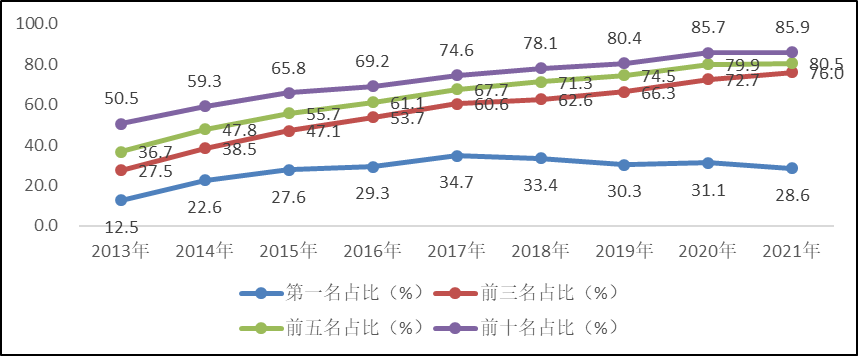 2021 年零售百强企业中,据估算,第 1 名天猫销售规模为 3.5 万亿元,占百强整体销售规模的比重为 28.6%,比 2020 年下降 2.5 个百分点;前 3 名销售规模合计为 9.2 万亿元,占百强整体销售的比重为 76.0%,比 2020 年上升 3.3 个百分点;前 5 名销售规模合计为 9.7 万亿元,占百强总销售的比重为 80.5%,比 2020 年上升 0.6 个百分点;前 10 名企业销售规模合计为 10.4 亿元,占百强总销售规模的比重为 85.9%,比 2020 年上升 0.2 个百分点。