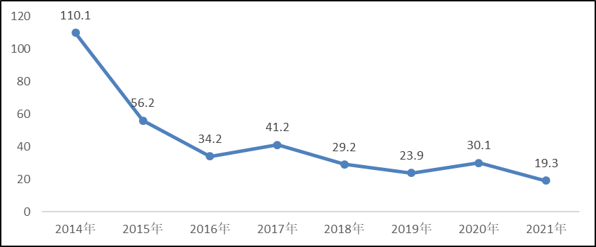 图表 6:2014-2021 年零售百强中电商总销售额同比增速(%)