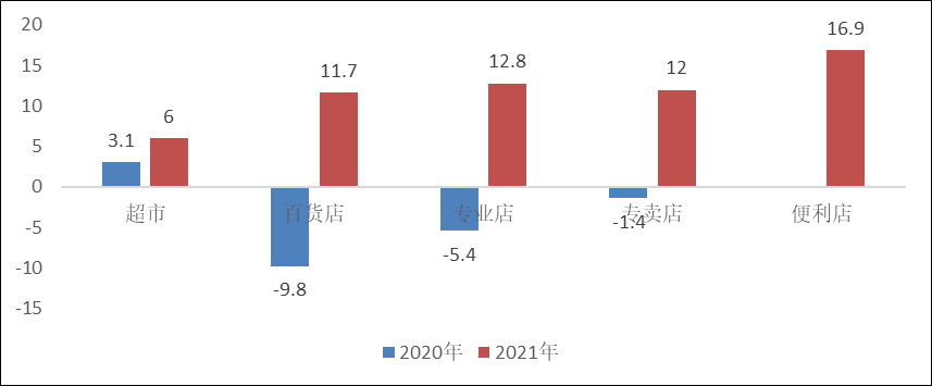 限额以上零售业态中,2021 年超市业态零售额同比增长 6%,增速快于上年 2.9 个百分点。百货、专业店、专卖店、便利店在居民消费特别是升级类消费快速恢复的推动下,均实现 10% 以上的较快增长。
