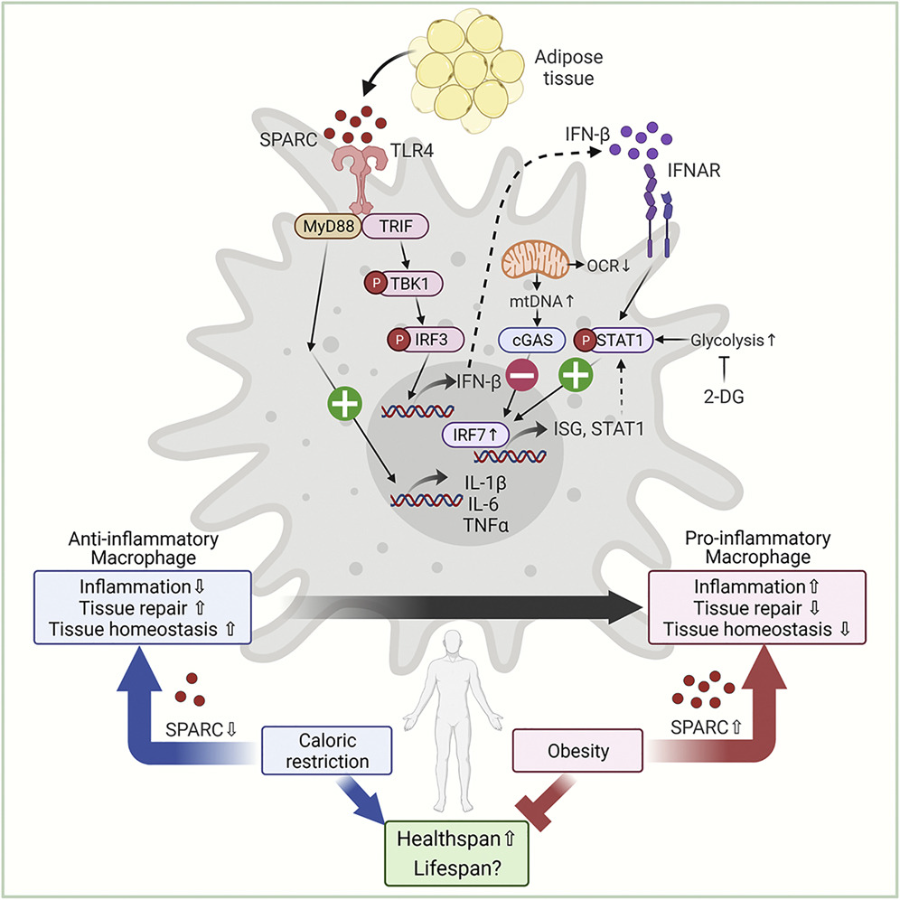 不出所料,小鼠体内的SPARC蛋白通过糖酵解和IRF7诱导巨噬细胞中的干扰素反应,并通过激活TLR4将原本抗炎的M2巨噬细胞转化为促炎表型M1巨噬细胞,从而促进了炎症的发生,造成健康损害。
