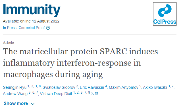 [1]Seungjin Ryu, Sviatoslav Sidorov, Eric Ravussin, Maxim Artyomov, Akiko Iwasaki, Andrew Wang, Vishwa Deep Dixit, The matricellular protein SPARC induces inflammatory interferon-response in macrophages during aging, Immunity, 2022, ,ISSN 1074-7613, https://doi.org/10.1016/j.immuni.2022.07.007.