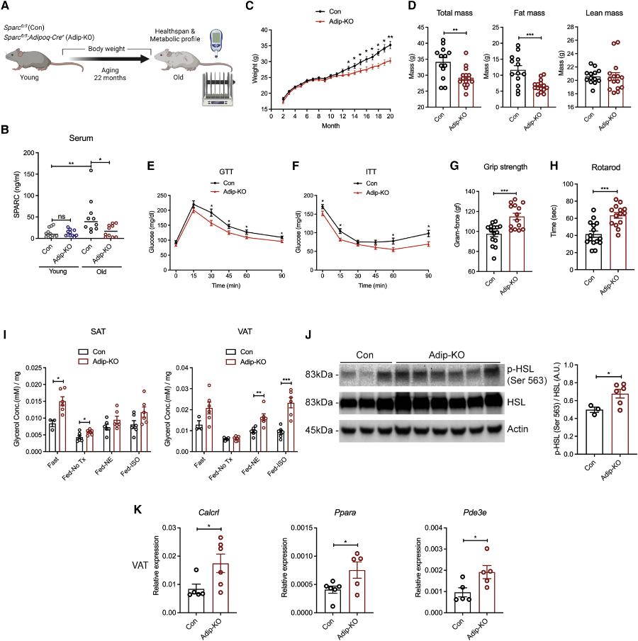 当研究者对比SPARC脂肪细胞缺陷小鼠与正常对照组时发现,降低小鼠脂肪细胞产生的SPARC蛋白,不仅改善了其葡萄糖耐量和胰岛素敏感性,更重要的是,实验组老年小鼠的虚弱程度明显降低(体现在老年小鼠焕发生命活力,不仅握力增强,还能在旋转杆上狂奔,堪称医学奇迹啊)。