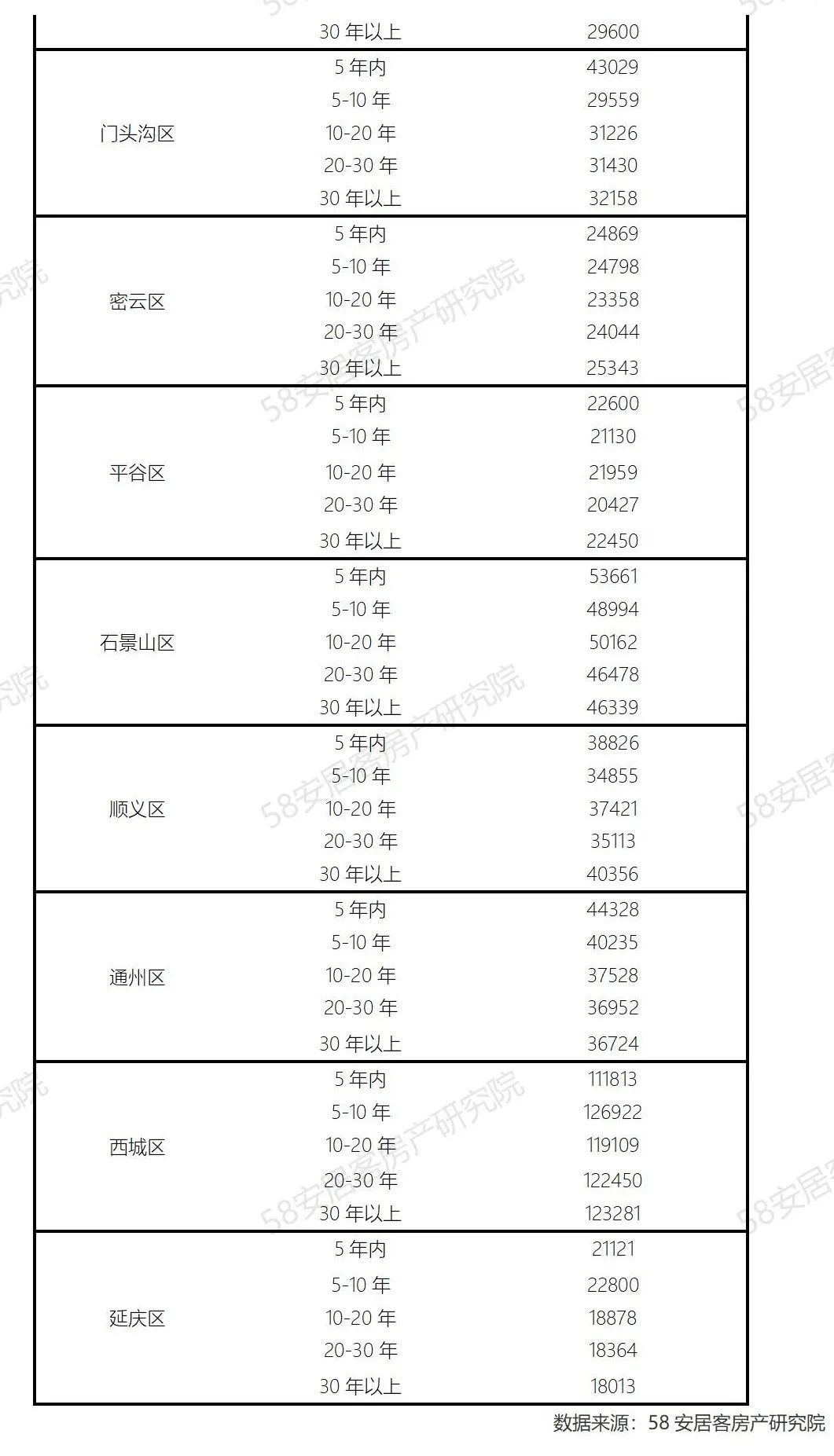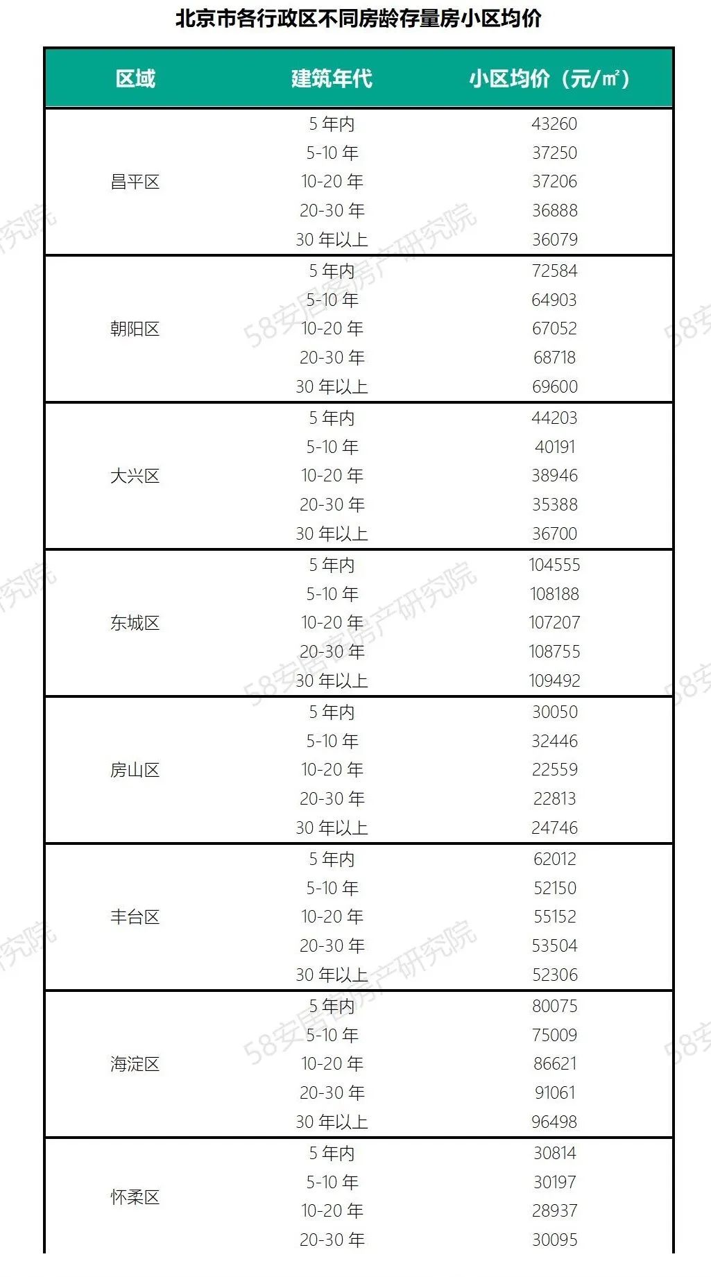 北京市各行政区存量房小区的房价和小区房龄并非都存在房龄越小,房价越贵的情况,如东城区和西城区的存量房小区各房龄段的价格水平相当,主要还是这两个区域存在部分部分可交易的四合院,并且区域内还有高品质学区资源的带动存量房单价的提升,还有海淀区也是类似的情况,其30年以上房龄的房屋单价是最高的。
