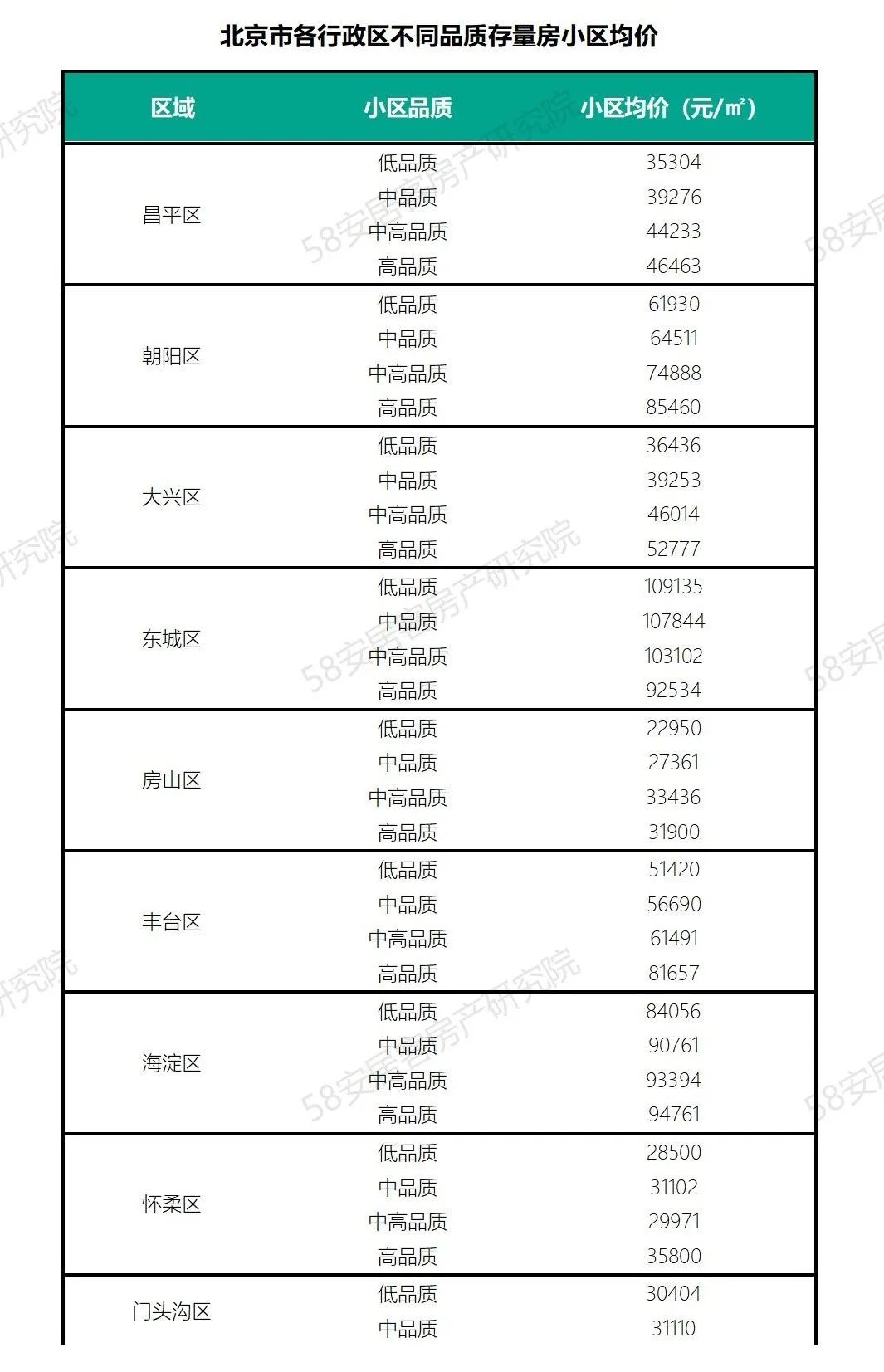 北京市各行政区存量房小区品质越好基本上房价会越高,不过东城区是略有不同,其品质越高,房价相对会低一些,主要还是板块内的四合院会影响其房价。