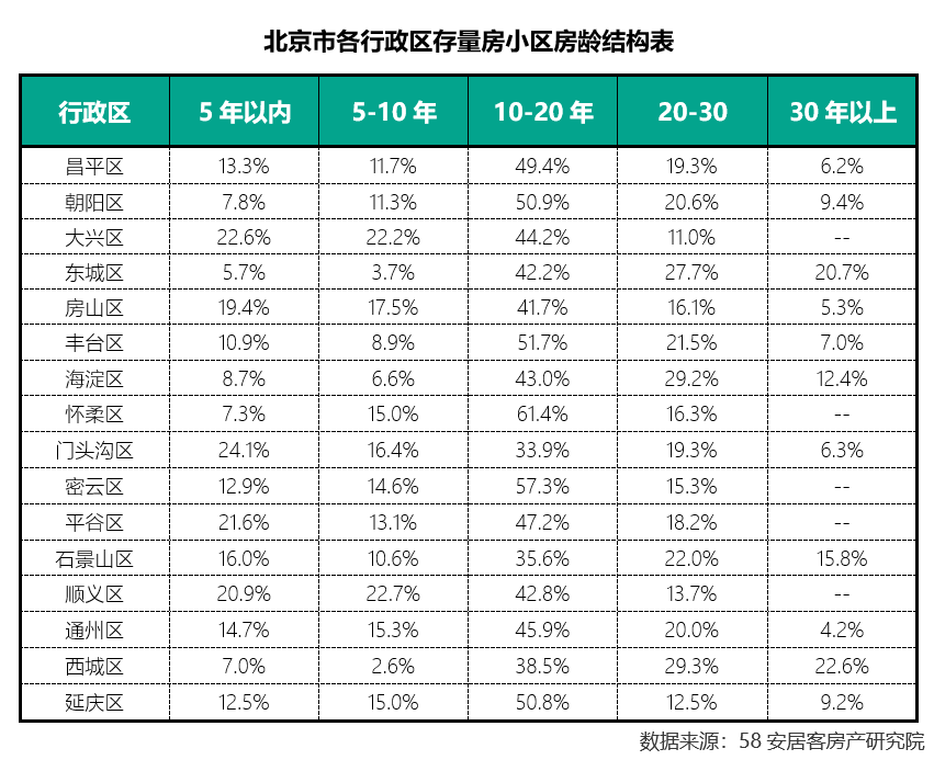 从北京市各行政区存量房小区房龄结构来看,东城区和西城区30年以上的老房子相对集中度较高,占比都超过了20%;门头沟区、平谷区和顺义区的存量房小区房龄较新,5年以内的存量房占比都超过了20%;朝阳区、丰台区、怀柔区、密云区和延庆区的10-20年的存量房小区占比最高,都超过50%。