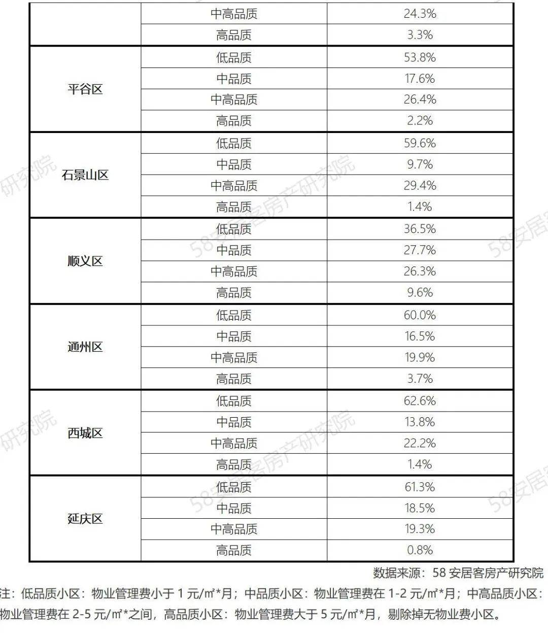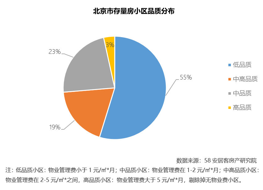 北京市存量房小区中,低品质小区占比为55%,主要是由于区域房龄会相对较老一些,影响到其物业费水平,不过中高品质和重品质小区占比也不低,分别有19%和23%,高品质小区占比3%。