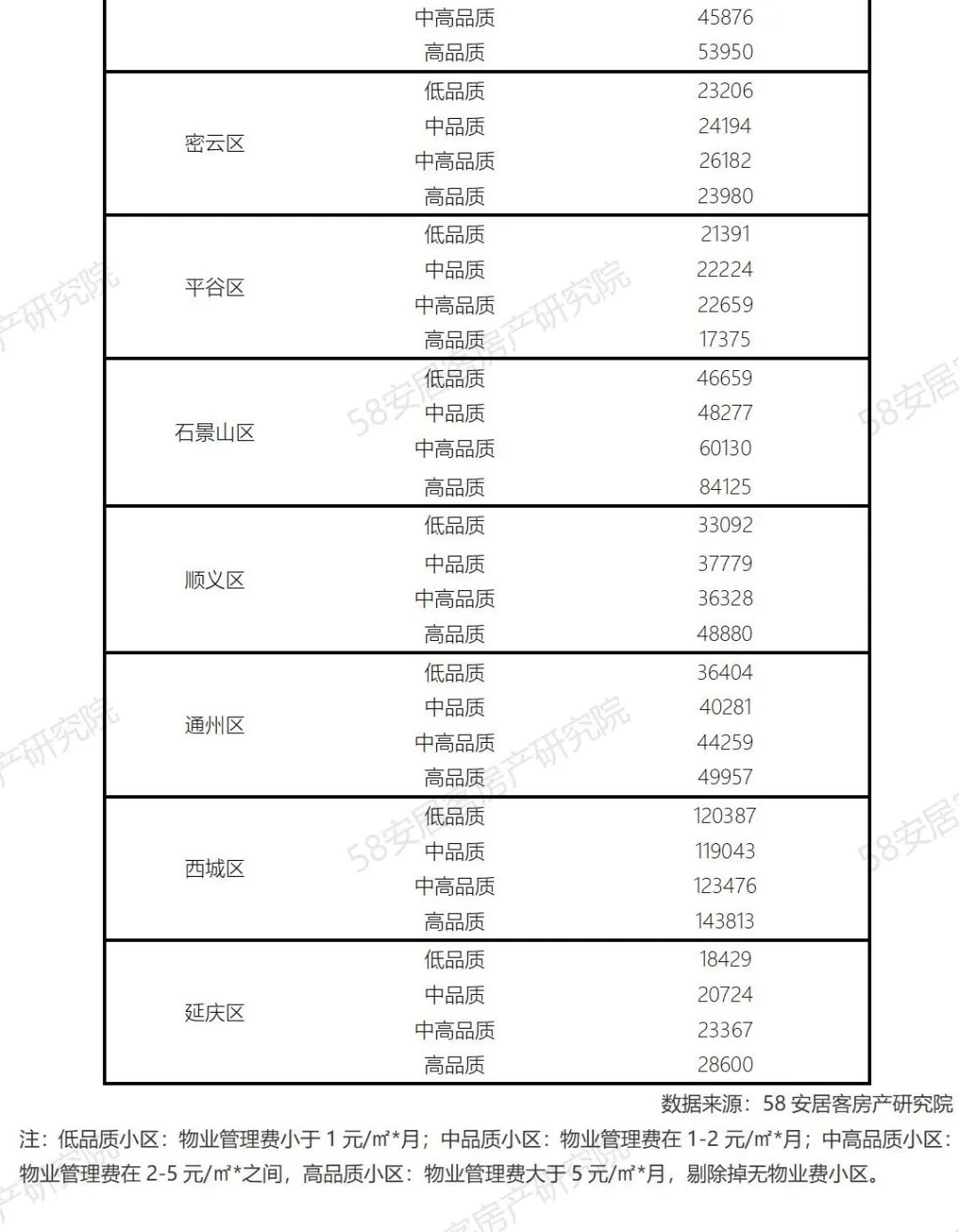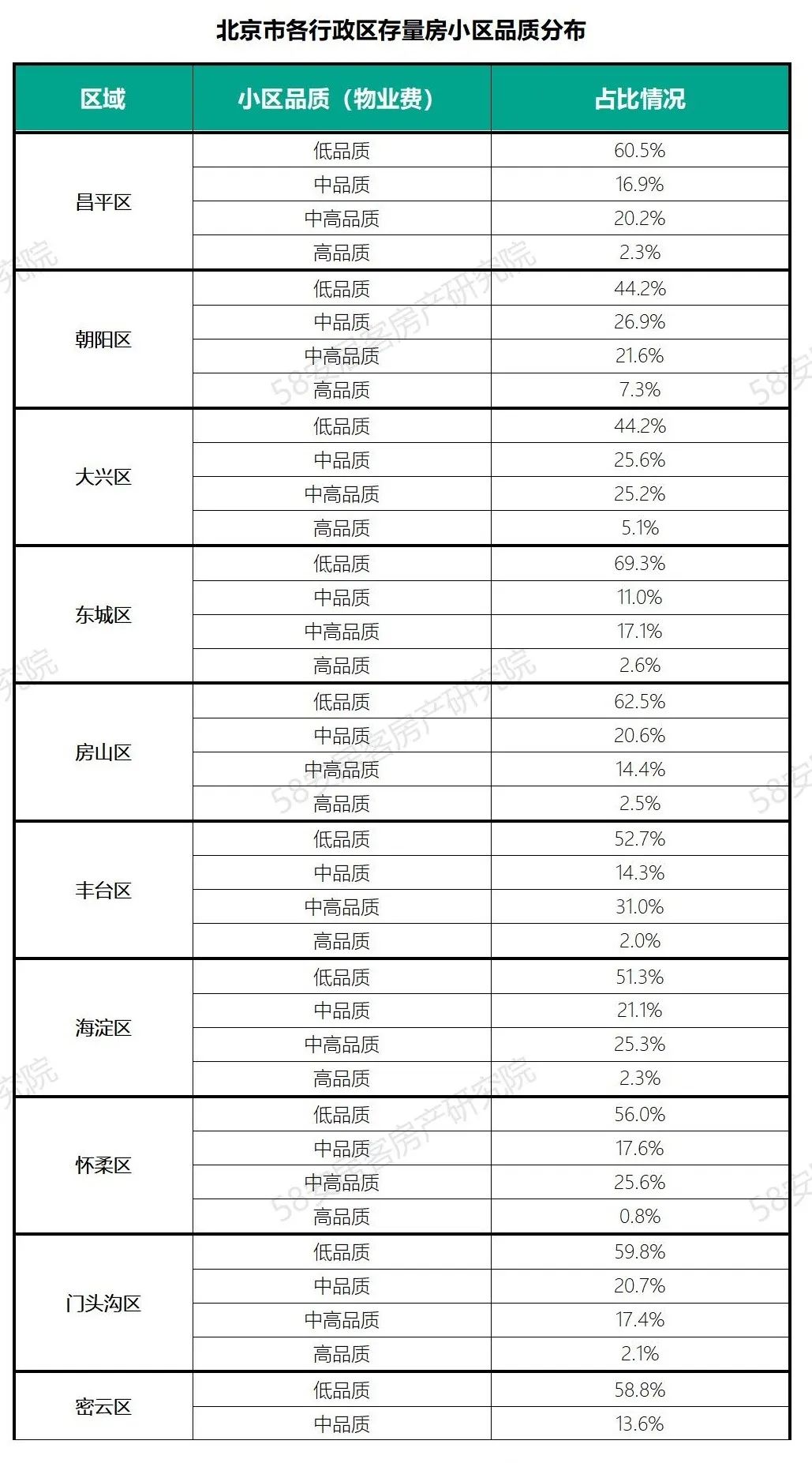 从北京市各行政区存量房小区分布来看,相对市中心区域的低品质小区占比会相对较高,由于受到这些区域内房龄相对较老,并且楼层都相对会较低,物业费也会因此低一些,从而影响到小区品质的高低。