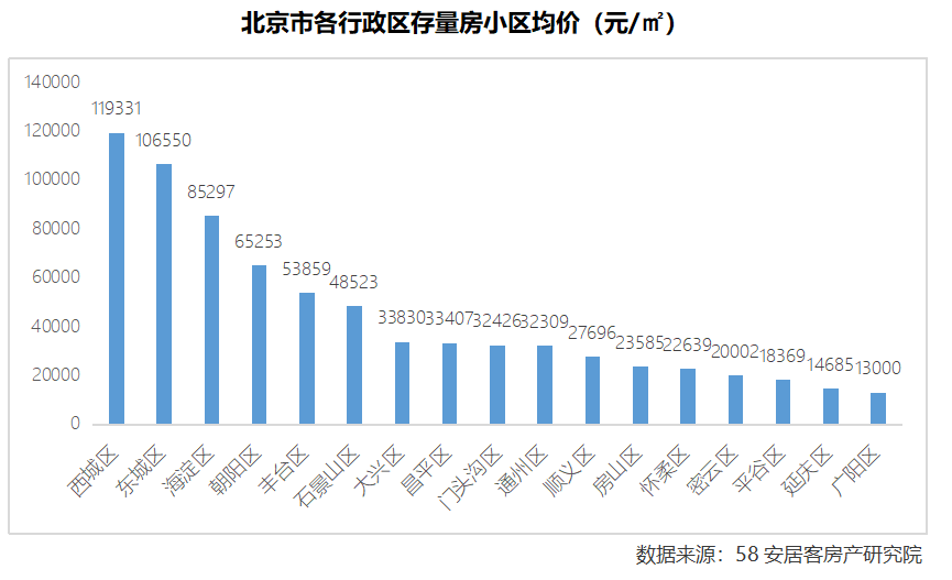 北京市各行政区存量房小区挂牌均价最高的区域为西城区和东城区,其均价超过了10万元/平方米;海淀区、朝阳区和丰台区的为其次,其小区挂牌均价为5-9万元/平方米之间,平谷区、延庆区和广阳区的小区挂牌均价为相对最大,在2万元/平方米以下的水平。