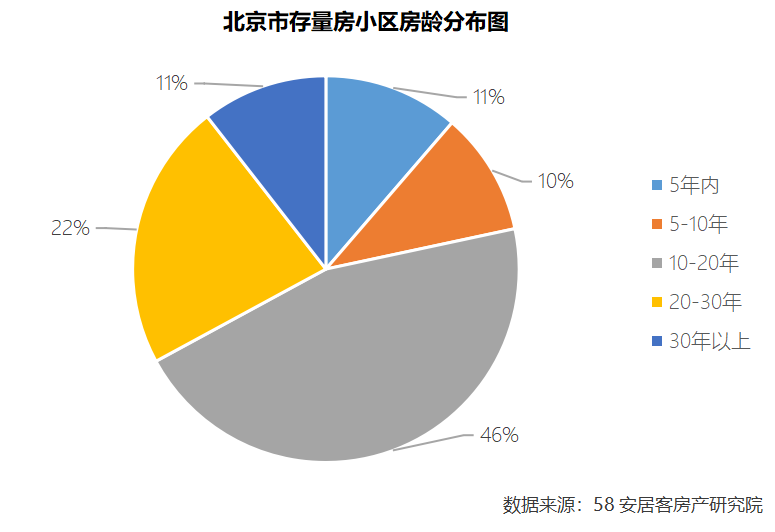 从北京市存量房小区房龄结构来看,主要为房龄在10-20年之间的小区为主,占比为46%,其次是房龄在20-30年之间的小区,房龄在10年以内的次新房相对较少,占比在21%,因此北京市的小区整体房龄结构会相对较老一些,其中还有房龄在30年以上的小区占比达到了11%。